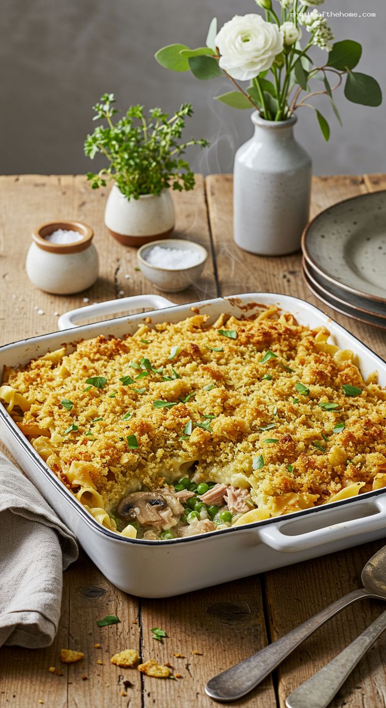 - Balanced flavors: savory tuna, sweet peas, and earthy mushrooms.