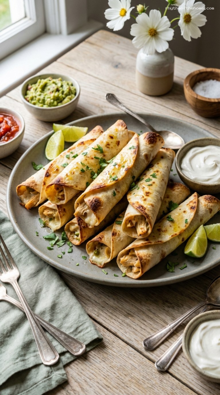 Remove the taquitos from the oven and let them cool for 3–5 minutes so the filling can set slightly. Transfer to a serving platter. Garnish with extra chopped cilantro if you like, and serve with guacamole, salsa, and sour cream or crema on the side for dipping. Lime wedges are a nice touch for squeezing over the top just before eating.