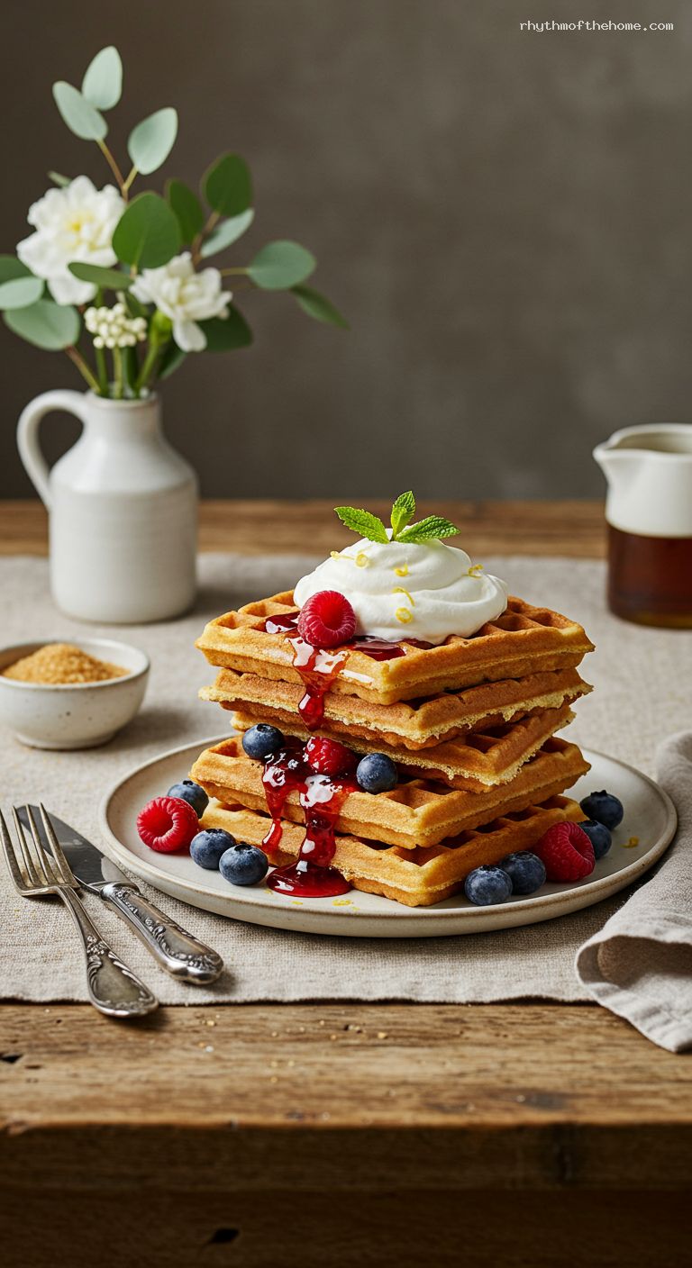 Plate waffles and spoon over warm berry compote. Add a generous dollop of whipped cream, drizzle with warm maple syrup, and garnish with fresh mint if using. Serve immediately while the edges are still shatter-crisp.