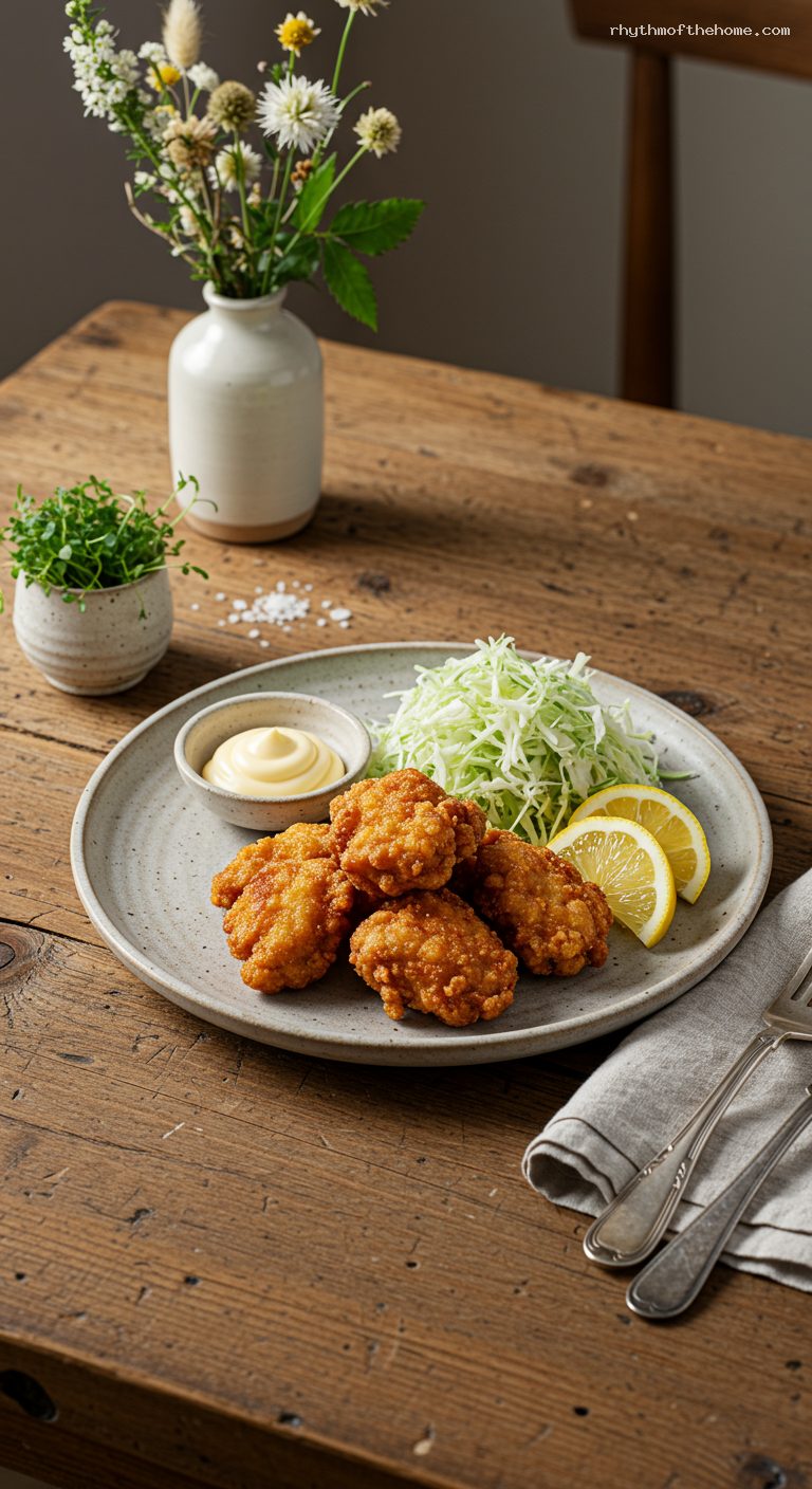 Increase oil to 190°C (375°F). Fry the chicken again for 45–60 seconds until deep golden, craggy, and very crisp. Drain on a rack. Plate with a fluffy mound of chilled shredded cabbage, a generous spoon of Japanese mayo, and lemon wedges. Sprinkle with scallions or a pinch of shichimi togarashi if you like. Serve immediately.