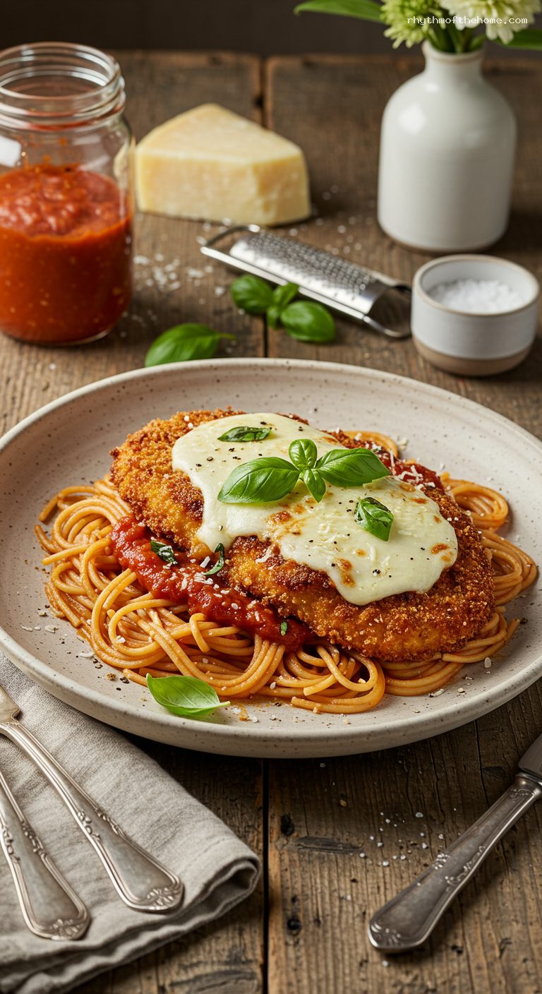 - Restaurant-style plating—nest of saucy spaghetti topped with cheesy chicken.