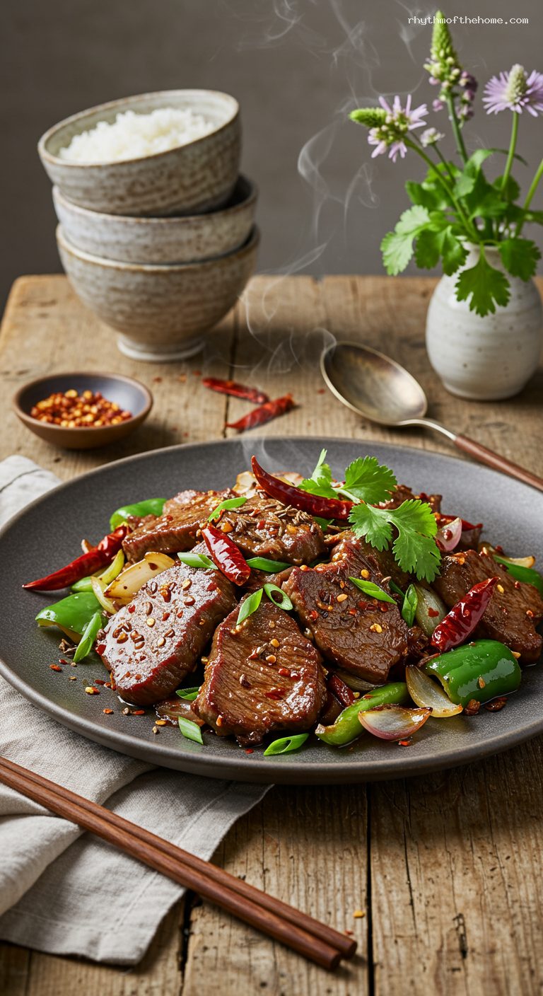 Transfer to a warm platter. Serve immediately with steamed rice or warm flatbread. The lamb should be tender with a smoky cumin aroma, bright chilies, and a gentle tingle from Sichuan peppercorns.