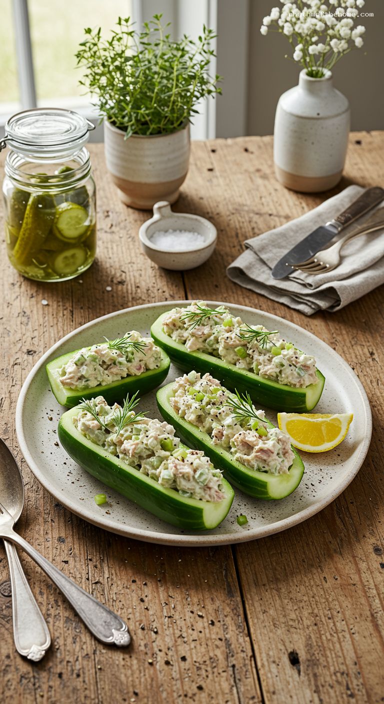 Pat the cucumber boats dry once more. Spoon the tuna salad into each boat, mounding it slightly so it looks generous. A small cookie scoop or two spoons makes neat portions.