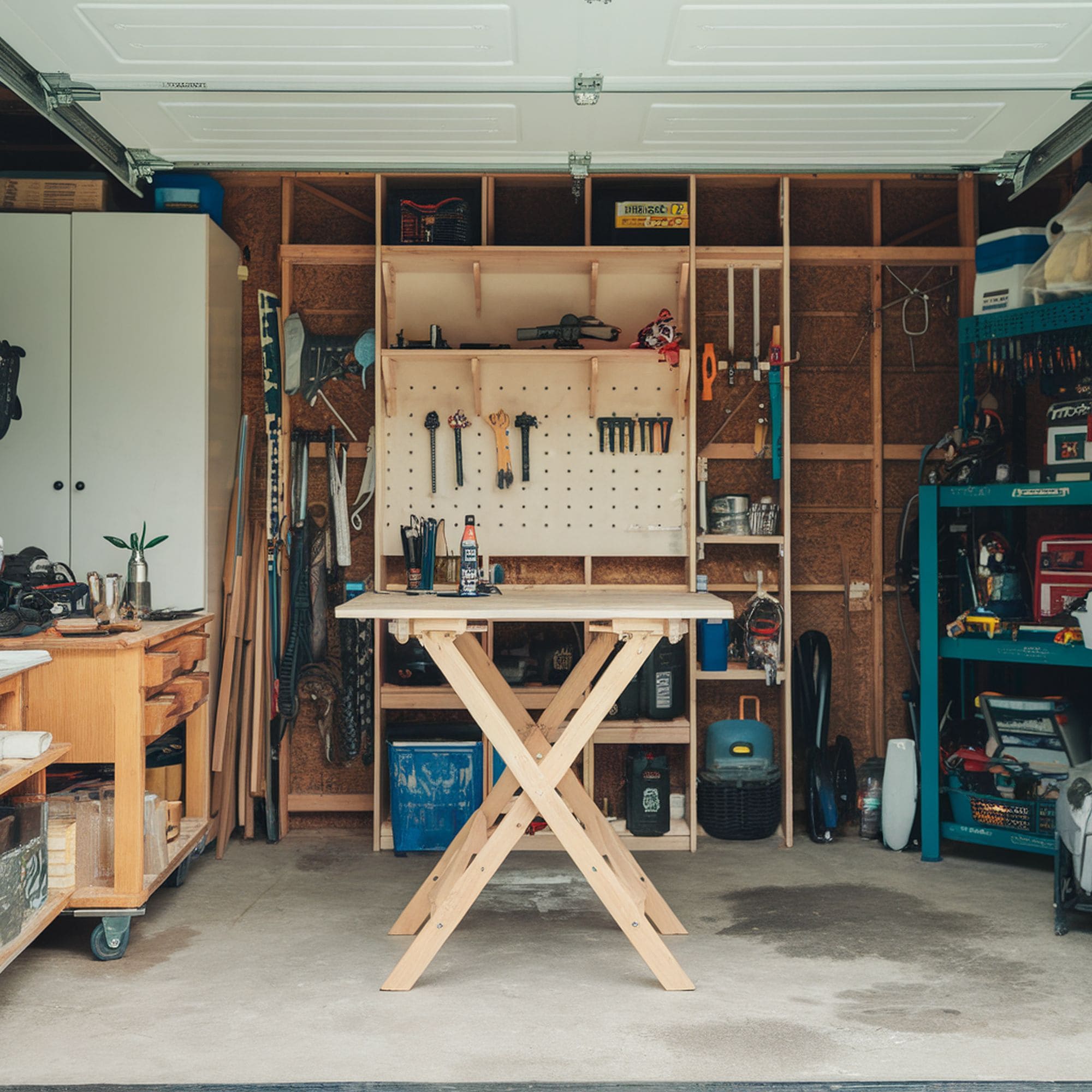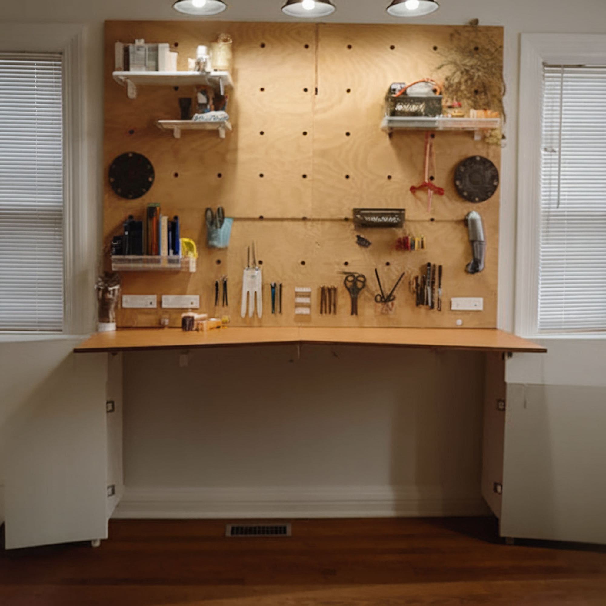 If you do not spend that much time on DIY projects or you don’t have a very spacious garage, this picture introduces you to a practical model. It is a beautiful fold-down workbench with a spacious pegboard for your supplies.