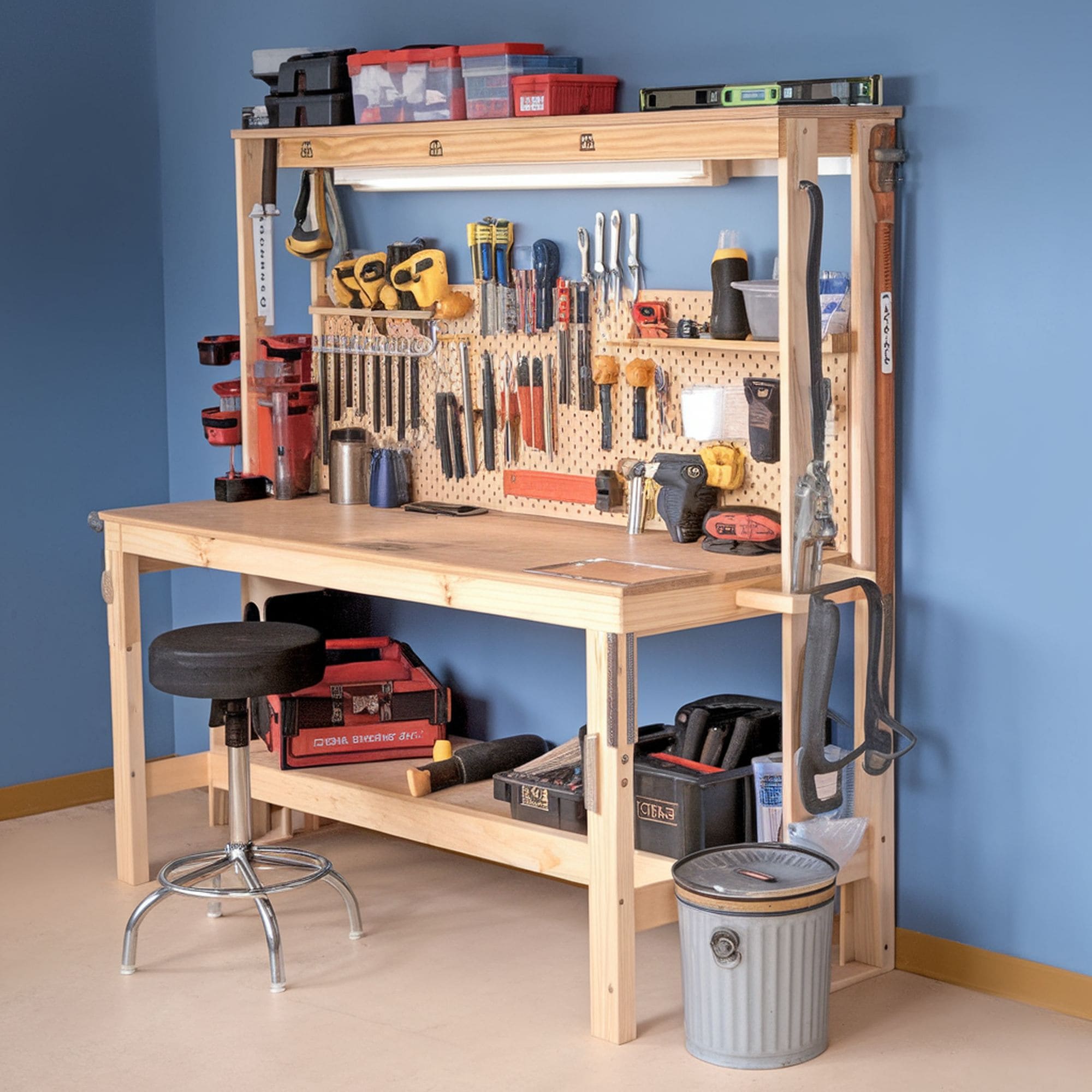 A smart workbench plan should consider plenty of storage space for your convenience. You may want to organize them for easy reach, so adding multiple drawers and a pegboard can be a lifesaver. Don’t forget the LED light above so you can work at any time during the day or night!