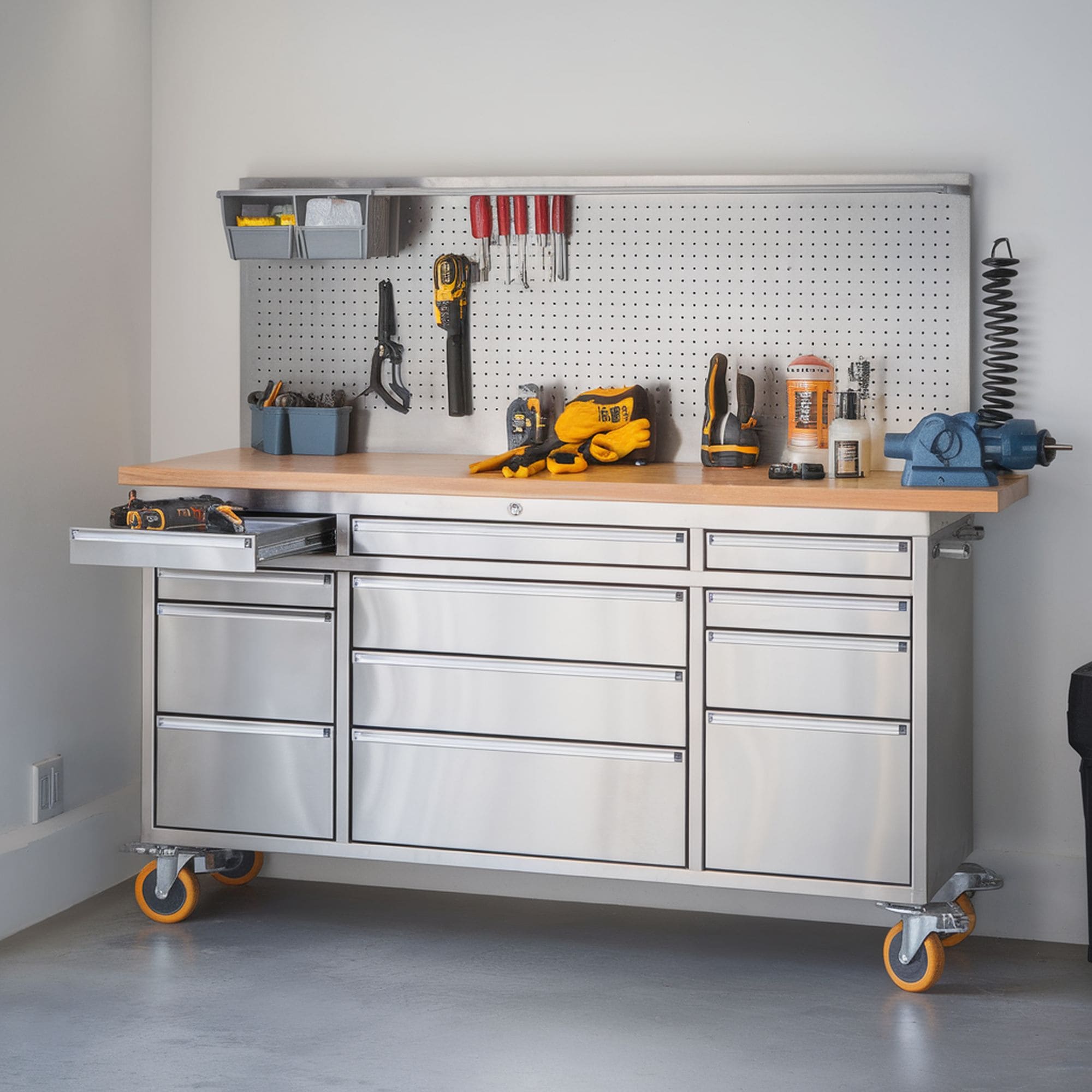 This workbench is perhaps one of the most appealing models on this list. Apart from its looks, it is also highly functional, durable due to the sturdy frame, and has plenty of drawers to accommodate tools and supplies of different sizes.
