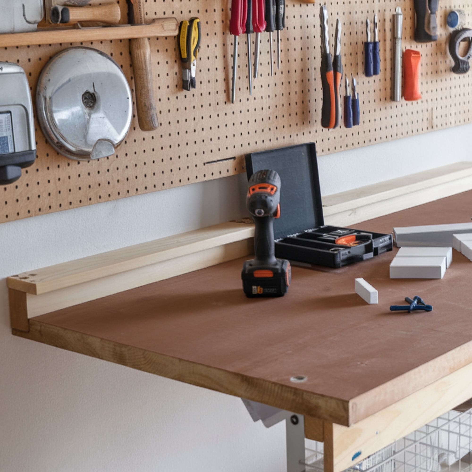 Despite its sleek look, this drop-down workbench can be extremely sturdy. Attach the top to the wall and then add the two legs using hinges, so you can drop the workbench down when not in use. It’s a winning idea if you are short on space!