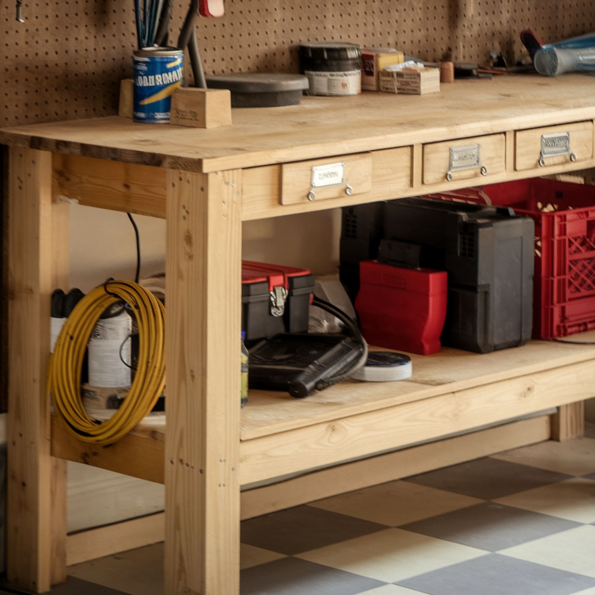 This workbench is crafted with portability and storage in mind. If you need to relocate often and have multiple heavy tools, this basic workbench plan could be an excellent option. You can add numerous shelves or even drawers to the frame if needed.