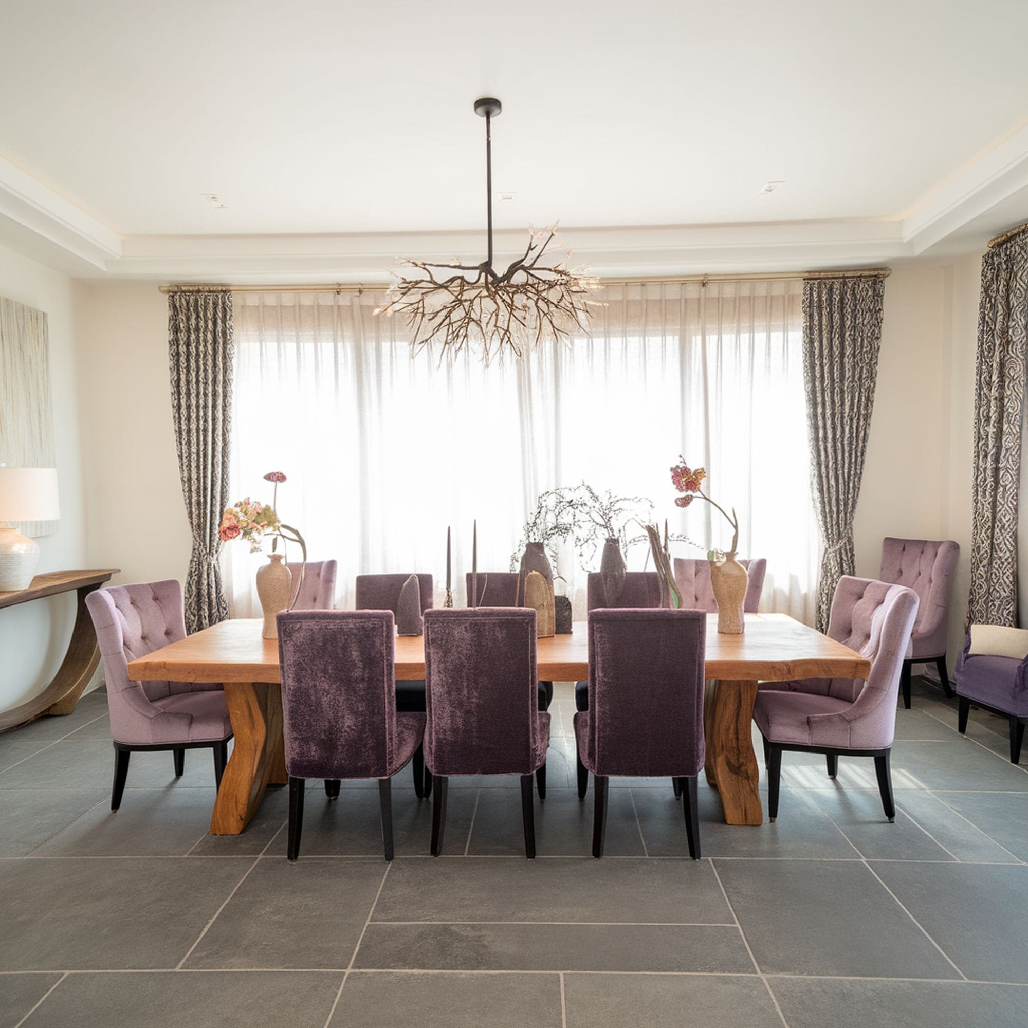 The tricky part is balancing the number of seats with your space limitations. How do you fit the most people, and still leave enough room for people to move freely through the space? For the best of both worlds, choose an oval shaped table to pack in as many people and encourage conversation. Pair a live edge wood table with wooden flooring or other woods tones in the space for a natural look. Opt for a round table for smaller compact areas and go with a rectangle shaped table if you have the room for large dinner parties.