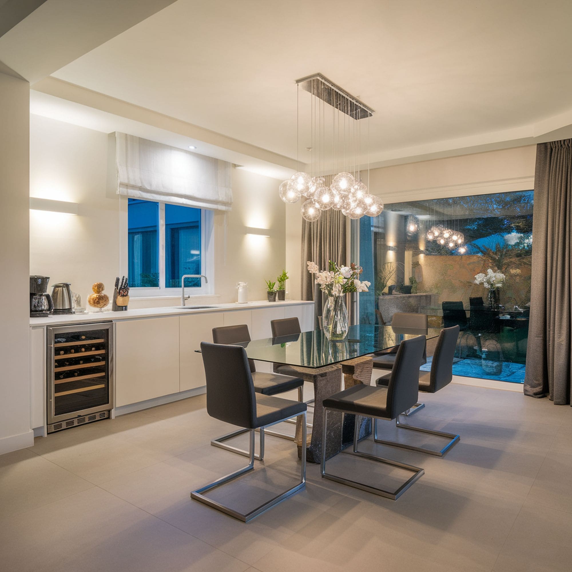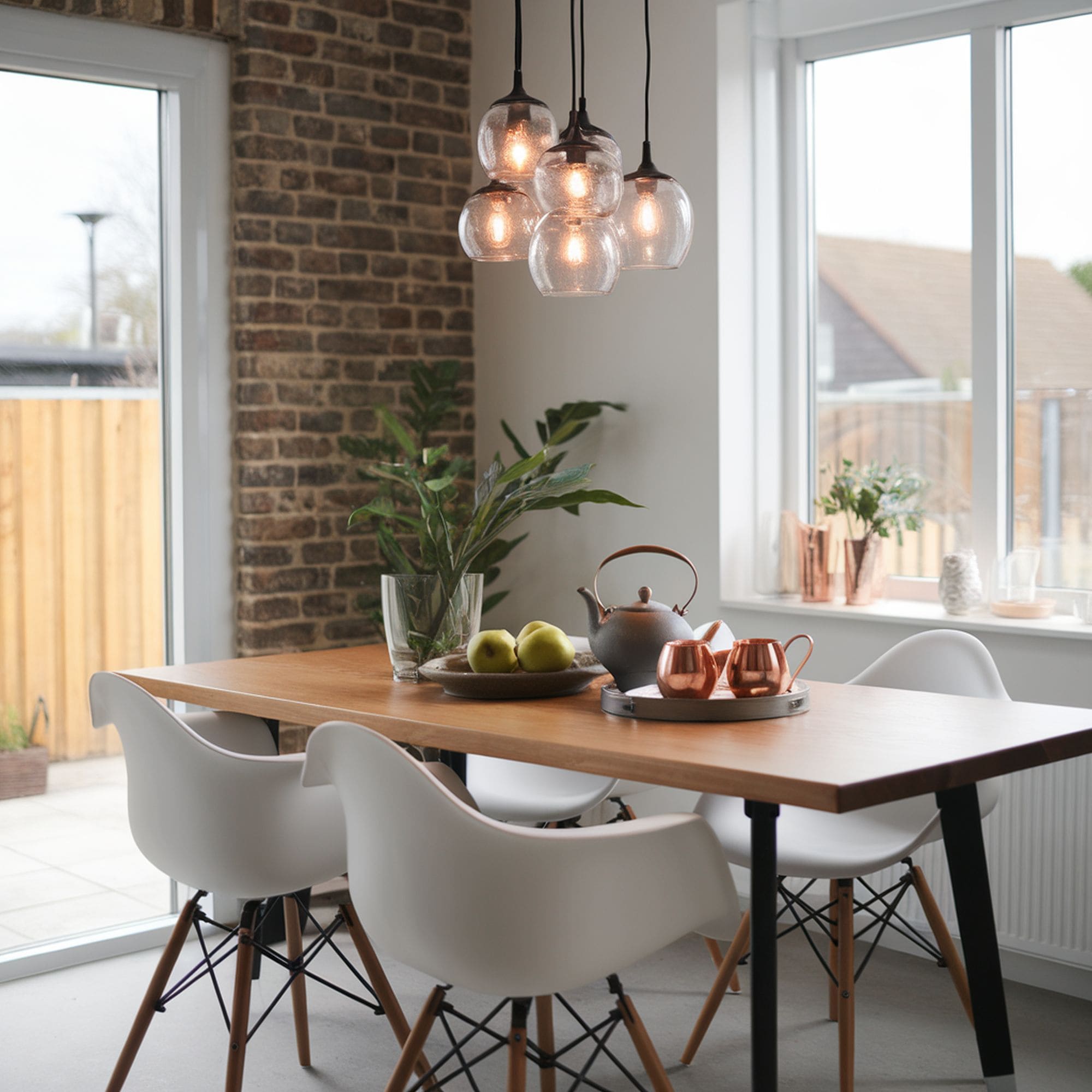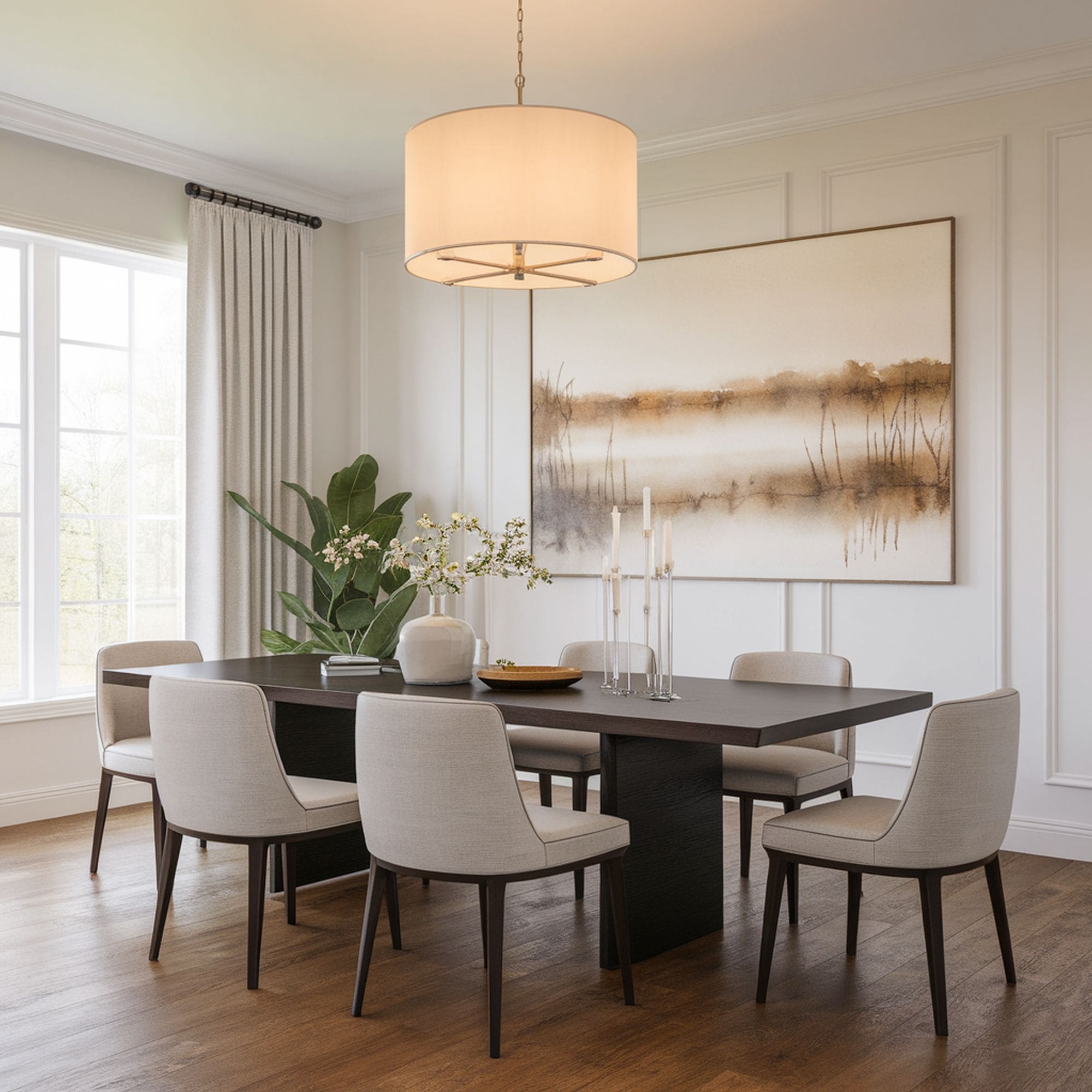 Hang a chic chandelier or stylish pendant to provide soft light to the surface of the dining table, and use supporting light elements like lamps or wall sconces to make the space even brighter. Install a dimmer switch for recessed lighting to gain more control of the mood, and opt for warm LEDs over the brighter incandescent bulbs in your lighting fixtures.
