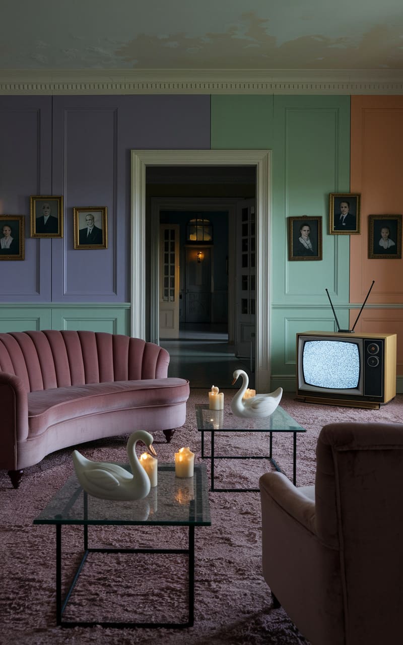 The room pulsed with a saccharine unease, a pastel-painted paradox where velvet curves met the static hum of a vintage TV. Swan figurines, eerily lit by flickering candles, perched on glass tables, their porcelain gaze locked on the doorway’s shadowed depths. Framed portraits hung askew, their stern faces hinting at forgotten narratives, while the mismatched halves of the walls seemed to vibrate with a discordant, almost tangible silence. It was a space where nostalgia curdled into something unsettling, a meticulously crafted stage for a dream you can’t quite shake.