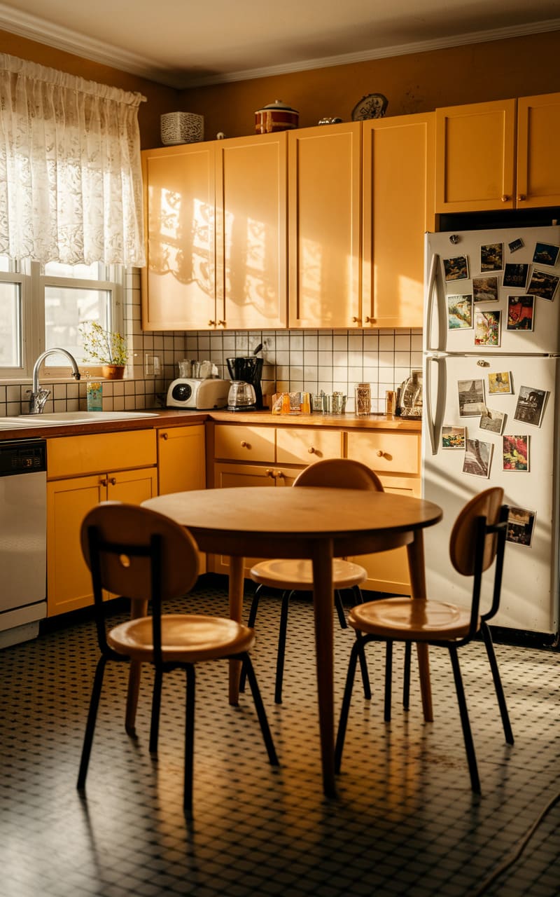 Sunlight, thick as honey, spills across a kitchen where time stutters; the retro-yellow cabinets glow with a warmth that feels both familiar and unsettling, while the checkered floor stretches into an impossible perspective. A simple round table, flanked by three identical chairs, waits patiently, yet the air is thick with the unspoken, a sense of a meal about to begin or perhaps already finished, leaving only the lingering echo of a forgotten conversation. It’s a space that whispers of childhood summers and the strange, comforting unease of being utterly alone in a place that should be bustling.