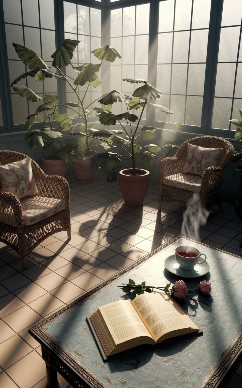 Sunbeams slice through a hazy, forgotten conservatory, illuminating dust motes dancing above a steaming teacup and an open book left mid-sentence. Wicker chairs wait patiently, their floral cushions mirroring the soft blush of roses scattered beside the pages. Oversized, almost cartoonish leaves cast long, distorted shadows on the cool tile floor, lending a surreal, Lynchian stillness to the room, a place where time seems to fold in on itself and whispers of half-remembered stories linger in the air.