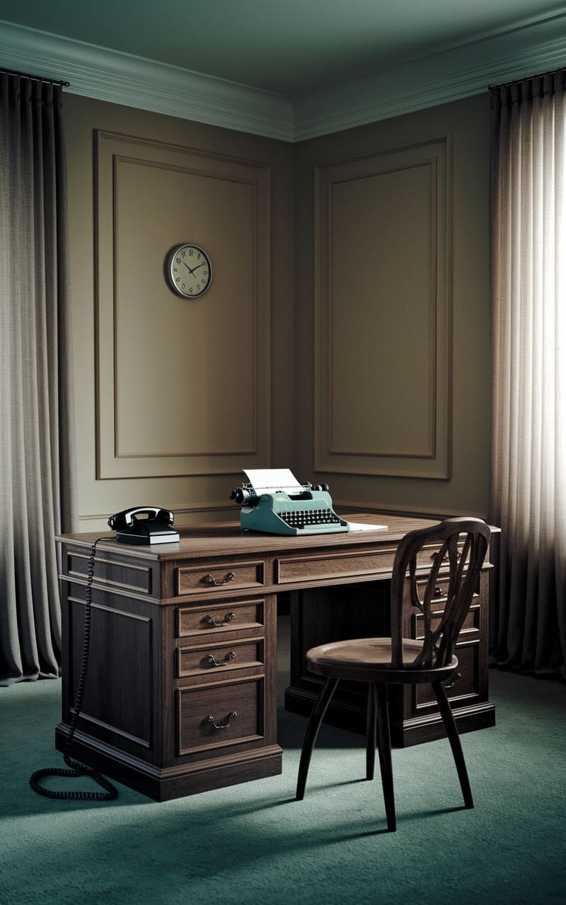 The room pulsed with a hushed, unsettling calm, a stage set for a play never performed. A heavy, antiquated desk, its drawers pregnant with secrets, anchored the space, facing a lone wooden chair like a silent audience. A vintage typewriter, a relic of forgotten narratives, sat poised, a single sheet of paper awaiting its ghostly author. The walls, the color of faded sepia, echoed with an unspoken dread, while the clock ticked in a rhythm that felt both urgent and eternally slow, a disquieting dissonance in the plush, muted atmosphere.