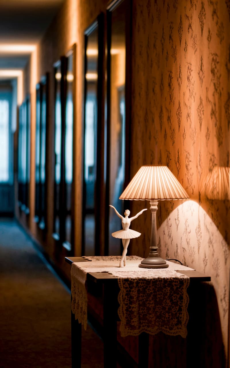 The hallway stretches, a liminal space of warm, patterned wallpaper and receding doorways, each reflecting a sliver of the unknown. A single lamp casts a soft glow, illuminating a tiny ballerina poised in an eternal dance, a fragile figure against the echoing emptiness. The scene hums with a quiet unease, a sense of waiting, where the familiar edges into something unsettlingly dreamlike.