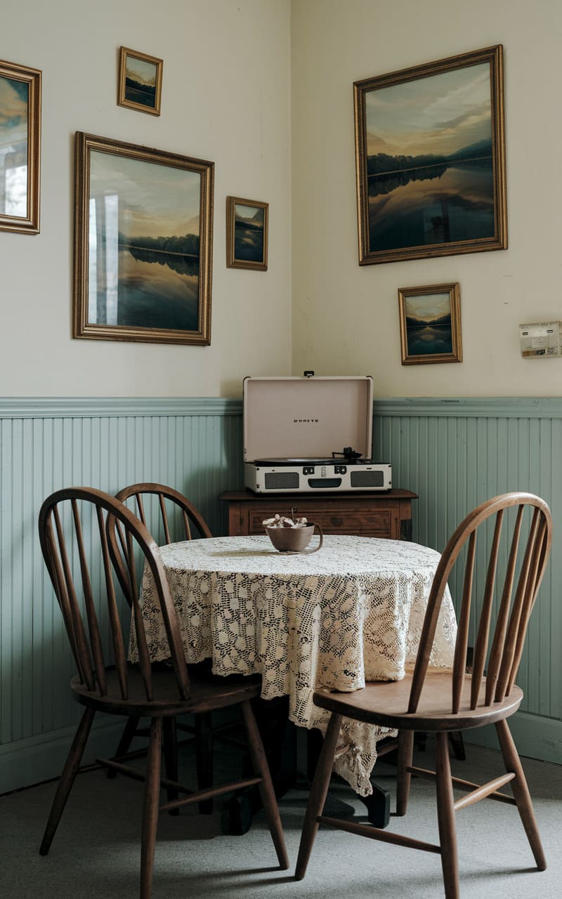 In a corner bathed in the soft, liminal glow of a perpetually overcast afternoon, a round table draped in lace holds the quiet promise of a forgotten tea party. Framed landscapes, reflections of a world both familiar and unsettling, line the walls, while a portable record player, poised to spin a tune from a bygone era, sits patiently, waiting for a ghostly guest to arrive. The simple wooden chairs, each a silent sentinel, invite you to sit, stay a while, and lose yourself in the gentle, melancholic hum of this dream.