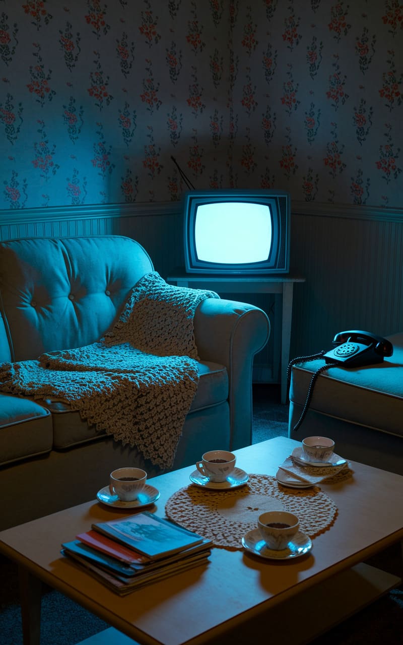 Bathed in an eerie, cyan glow, a vintage television flickers blankly in a room where floral wallpaper peels and a crocheted throw droops lifelessly over a plush sofa. A neatly arranged coffee service, with cups untouched, sits on a low table, a silent testament to an unseen gathering, while a rotary phone rests expectantly nearby, its coiled cord a dark, snaking line in the unsettling stillness. The scene hums with a quiet, unsettling nostalgia, a frozen moment in a dream where time feels both distant and immediate.