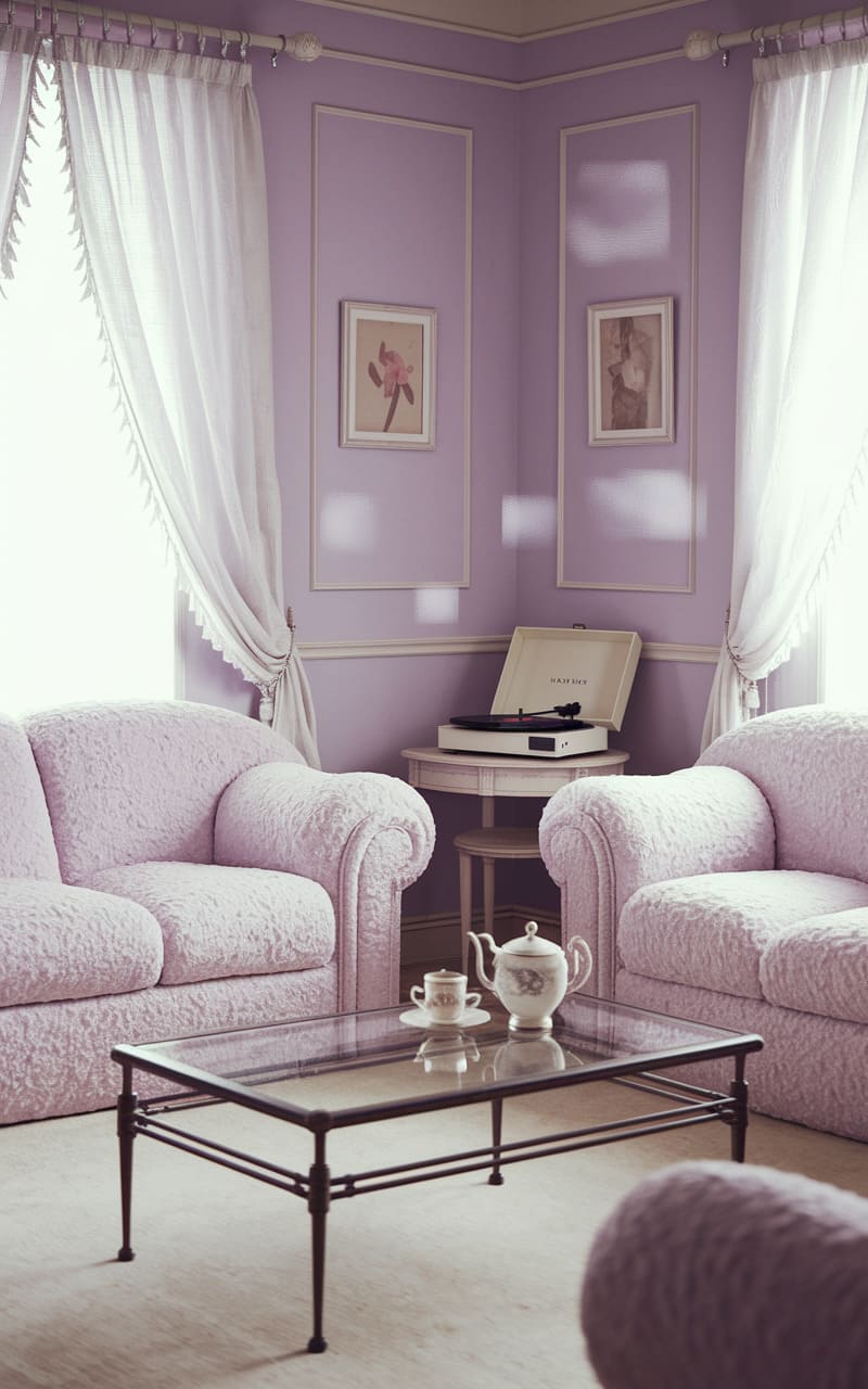 Sunlight spills through gauzy curtains, softening the lilac walls of a room where time seems to fold in on itself. Fuzzy, cloud-like sofas beckon, their pastel pink a whisper against the muted lavender. A record player sits poised, ready to spin a melody only dreams can hold, while a delicate tea set waits patiently on a glass table, as if expecting a guest who exists only in the quiet corners of memory. The air is thick with a nostalgic stillness, a place where the familiar and the surreal dance in a hazy, comforting embrace.