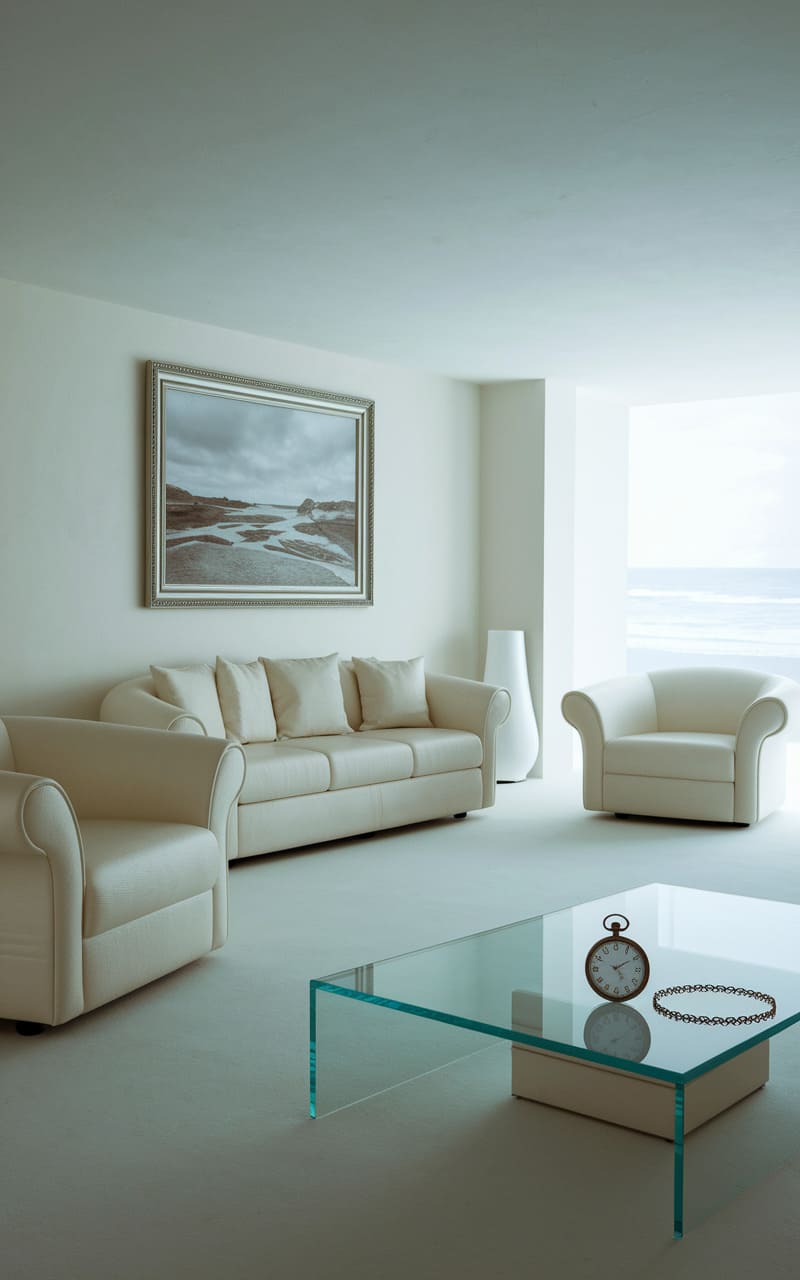 The room hummed with a quiet, off-white emptiness, a space where the soft contours of plush seating seemed to float rather than rest. A framed landscape mirrored the blurred, endless horizon visible through a distant window, while a glass table held a pocket watch and chain, frozen in a timeless tableau. The air felt thick with unspoken stories, a liminal space caught between waking and dreaming, where the familiar became unsettlingly serene.