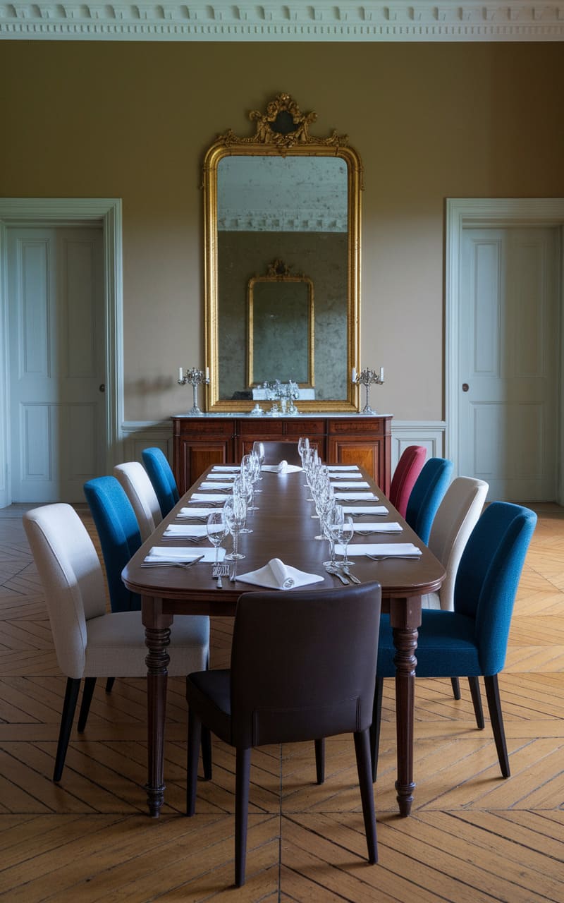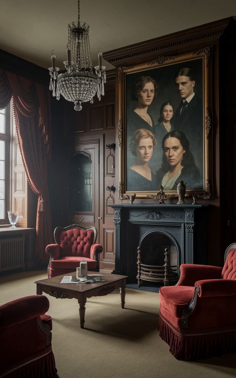 This room feels like a forgotten whisper of a bygone era, draped in deep mahogany and crimson velvet, where time lingers in the dust motes floating through dim afternoon light. A massive, unsettling family portrait looms over the fireplace, its somber faces seeming almost too aware of the present. The chandelier glistens with a cold, spectral glow, casting shadows that stretch and breathe across the dark-paneled walls. A faint trace of perfume and old paper lingers in the air, as if the ghosts of past conversations still murmur between the tufted chairs.