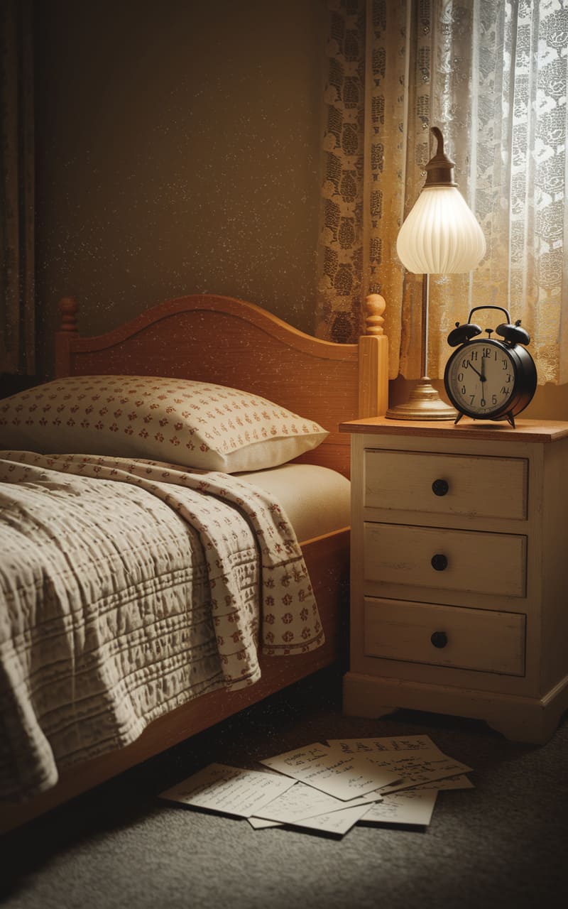 Dusty sunlight slices through the slats of a half-drawn blind, painting stripes across faded floral wallpaper and a rumpled bed that whispers of forgotten sleep. An antique alarm clock sits frozen on a bedside table, its face a blank stare, while a porcelain doll perches on a lace-draped dresser, an unsettling sentinel in the golden haze. The room feels both cozy and claustrophobic, a liminal space where time bends and reality blurs, inviting you to step into a dream that might just be a little too real.