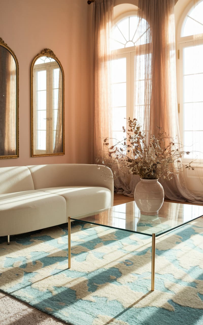 Sunlight slices through sheer drapes, painting the peachy walls with a warm, hazy glow, while the cool, geometric rug below seems to ripple like water under a glass-topped table. Two ornate mirrors, slightly askew, reflect a distorted version of the scene, hinting at a world just beyond the familiar, where time bends and perspectives shift. It’s a space that feels both nostalgic and unsettling, a liminal moment captured in soft focus, where the comfort of home blurs into the uncanny.