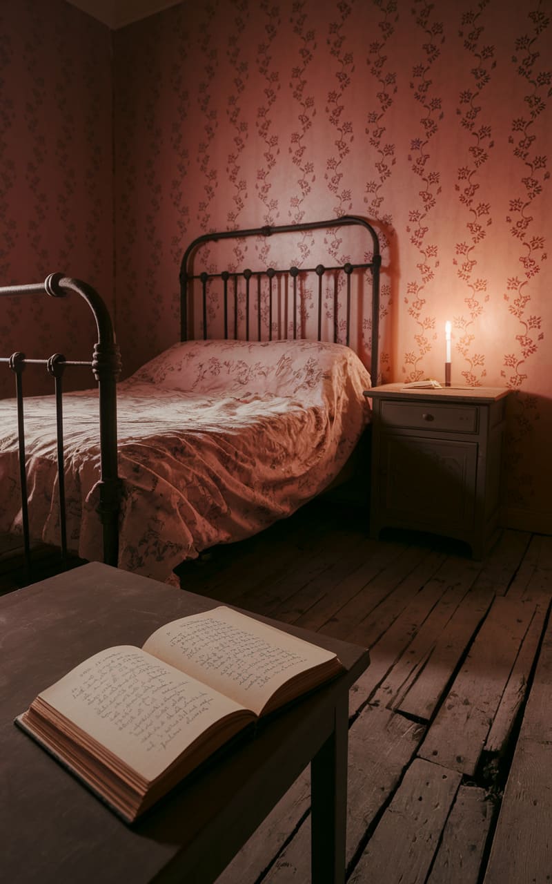 The room hummed with a hushed, unsettling quiet, a relic from a forgotten childhood nightmare. A wrought-iron bedstead loomed, its linens rumpled like a sigh, while a single candle flickered on a bedside table, casting long, dancing shadows that distorted the floral wallpaper into creeping vines. An open book lay abandoned on a dark table, its pages filled with an indecipherable script, a silent testament to a story left unfinished in this liminal space between waking and sleeping.