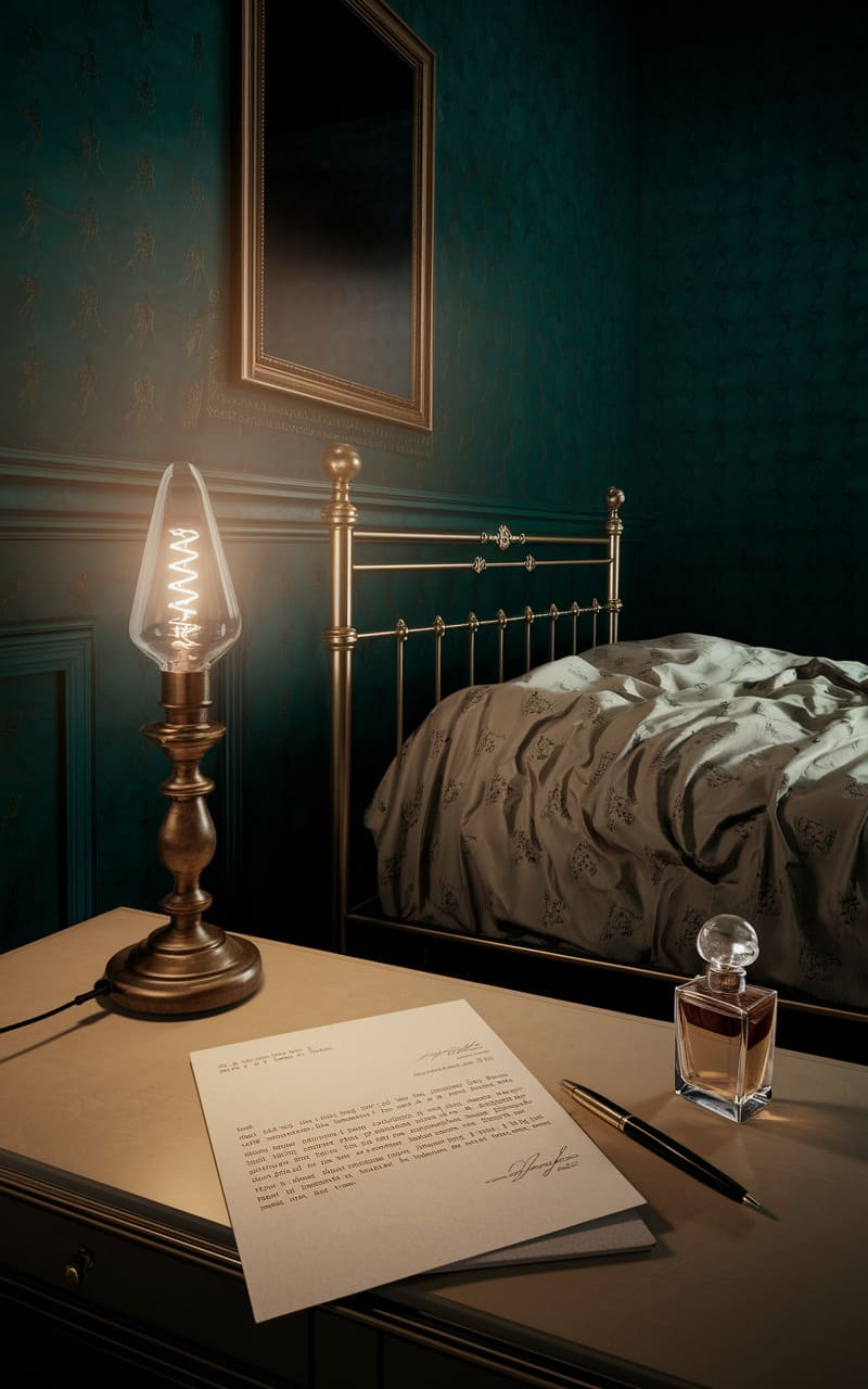 The room hummed with a hushed, almost theatrical stillness, its teal walls swallowing light like a secret. A single, exposed-filament bulb cast a warm, anachronistic glow over a letter left half-written, a pen poised mid-sentence like a frozen thought. The bed, a tangle of satin and shadows, hinted at a restless slumber, while a perfume bottle stood sentinel, its faceted glass catching the light like a captured star. It felt less like a bedroom and more like a stage set, a tableau frozen in the liminal space between waking and dreaming.