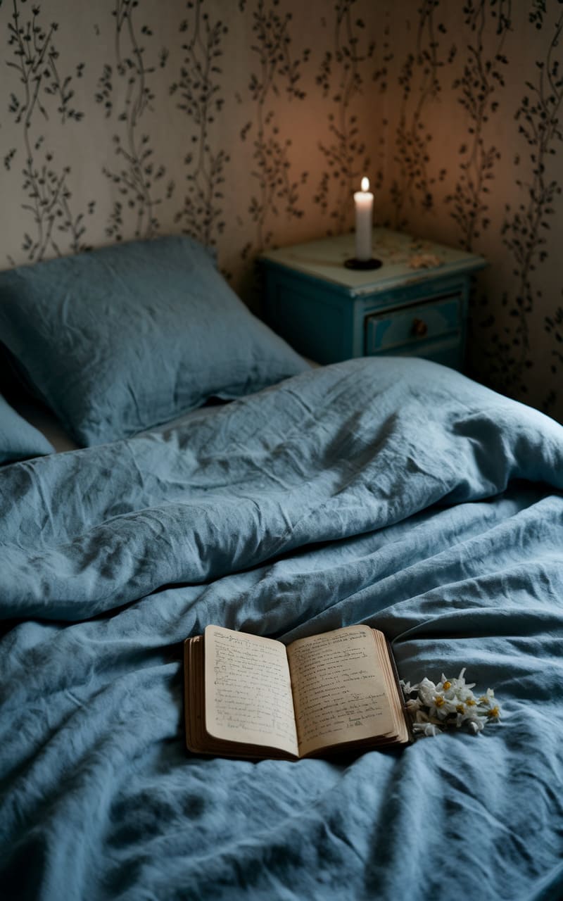 The room hums with a quiet, candlelit melancholy, a rumpled sea of blue linen swallowing a forgotten book and a sprig of wilted daisies. Wallpaper whispers of tangled branches, a silent story etched in faded ink. The bedside table, a chipped teal relic, holds a single flame, casting a warm, unsteady glow that barely pierces the soft, enveloping shadows. It’s the kind of space where time stretches and blurs, a half-remembered dream lingering just beyond the waking edge.