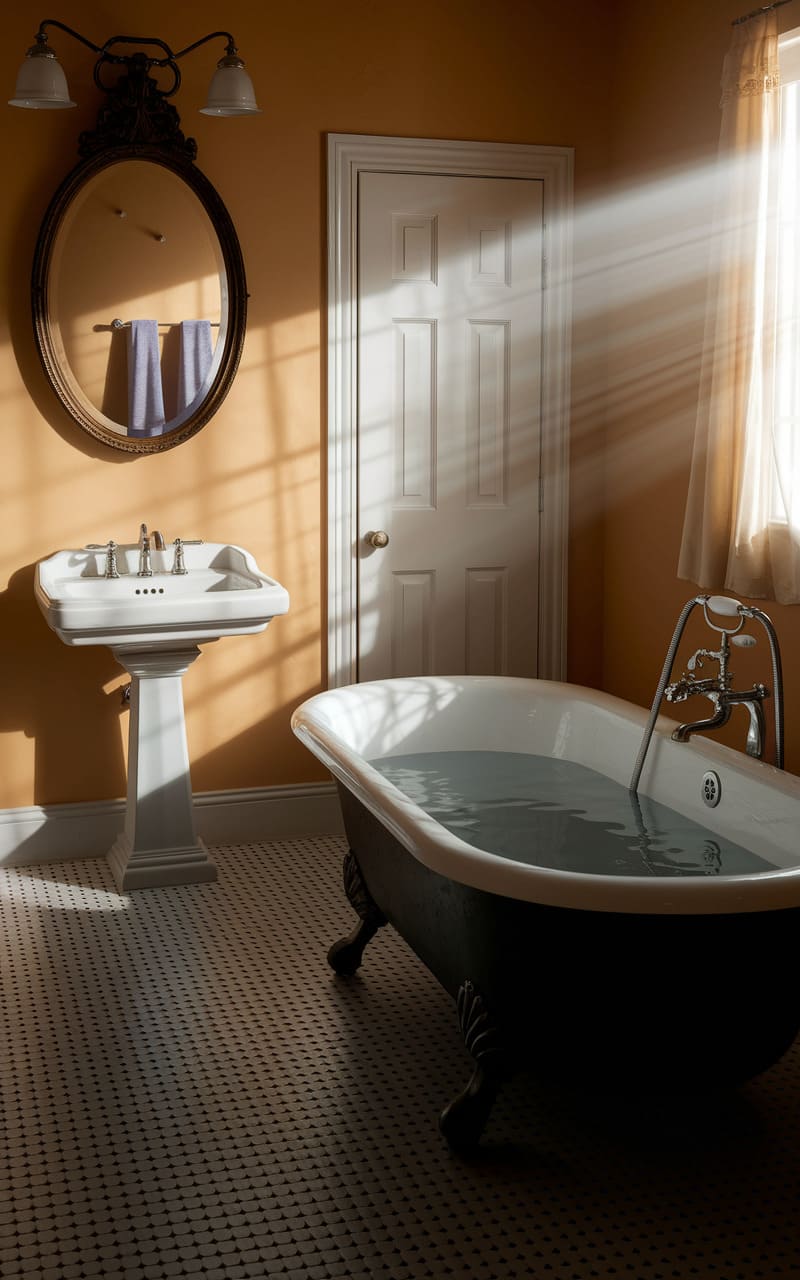 The bathroom hums with a liminal warmth, sunlight slicing through the stillness like a forgotten memory. A clawfoot tub, filled to the brim with a dark, reflective liquid, anchors the space, its vintage faucet gleaming like a lost relic. A stark white pedestal sink stands sentinel, while an ornate mirror, its reflection obscured, hints at a world just beyond the surface. The walls, a muted peach, seem to absorb the light, creating an unsettling yet comforting sense of being adrift in a dream.