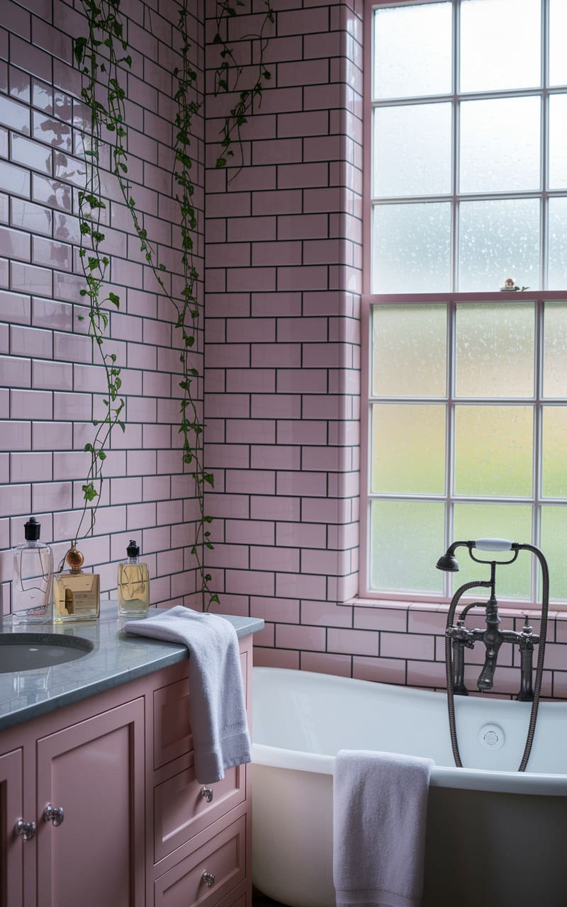 32. Pale Pink Dreamcore Bathroom with an Overgrown Garden Aesthetic