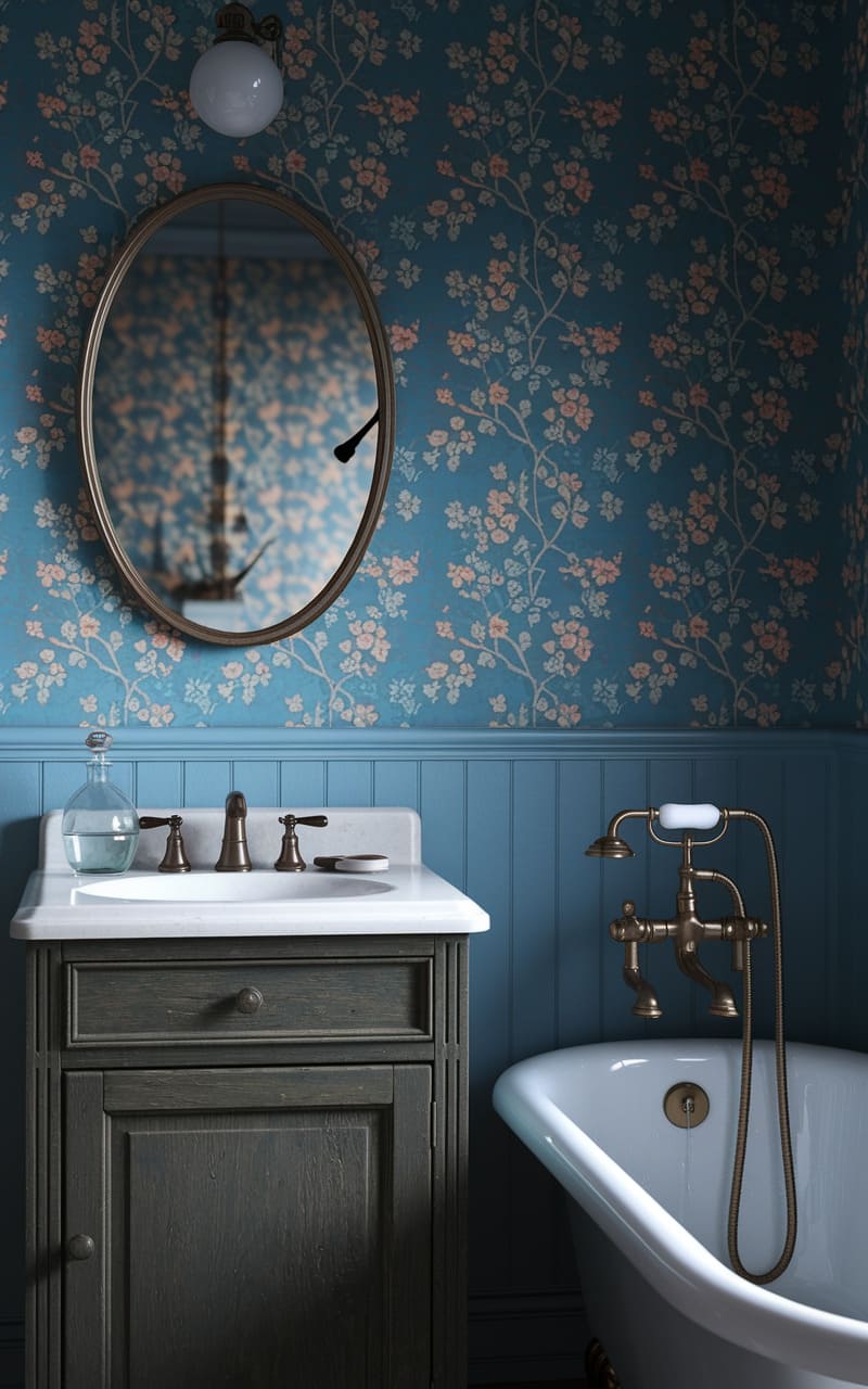 33. Dreamcore Bathroom with an Oval Mirror and Floral Wallpaper