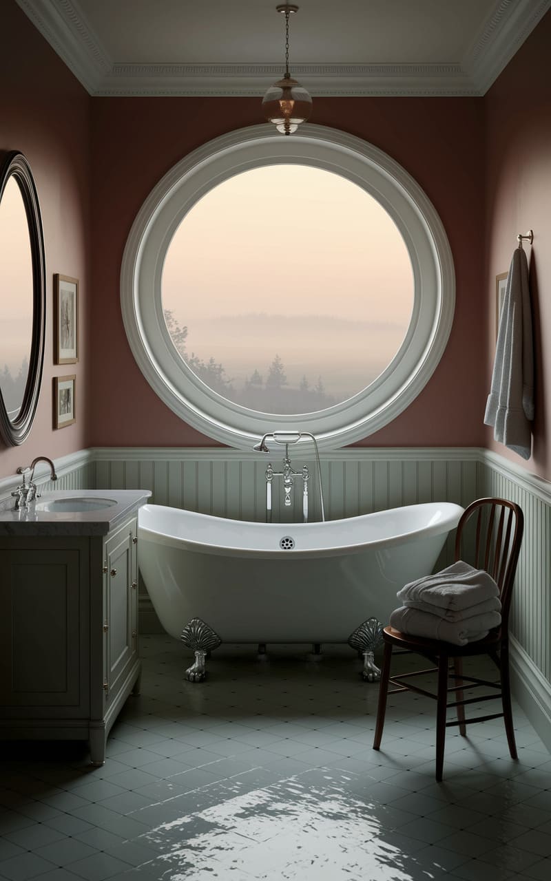 A hazy dawn filters through a colossal, porthole-like window, casting a soft, ethereal glow over the bathroom. The room, a blush-toned dreamscape, holds a clawfoot tub poised like a porcelain ship amidst a sea of slick, grey tiles. A lone wooden chair, draped with towels, awaits a phantom bather, while the world outside the circular frame dissolves into a misty, timeless horizon. It’s a space where reality blurs, and the mundane transforms into a tranquil, otherworldly tableau.