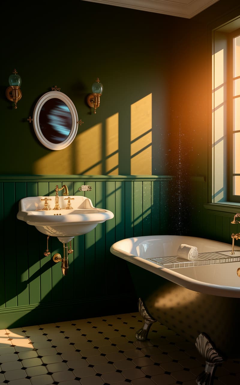 In the liminal glow of a golden hour that never sets, this bathroom exists in a perpetual, sun-drenched afternoon. The deep forest green walls, punctuated by the stark white of the vintage fixtures, feel both comforting and unsettling, like a memory half-remembered. The off-kilter perspective and the impossibly long shadows cast by a window that hints at a world beyond suggest a space where time bends and reality blurs, a tranquil yet subtly disorienting haven in the depths of a dream.
