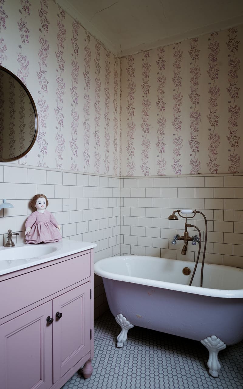The bathroom felt like a forgotten dollhouse, its pastel pink wainscoting and floral wallpaper clinging to a bygone era, while the checkerboard floor tilted slightly, a subtle unease disrupting the symmetry. A pedestal sink, too pristine for the space, stood like a porcelain ghost, reflecting the warm glow of an ornate sconce that cast long, distorted shadows, hinting at secrets hidden just beyond the frame.