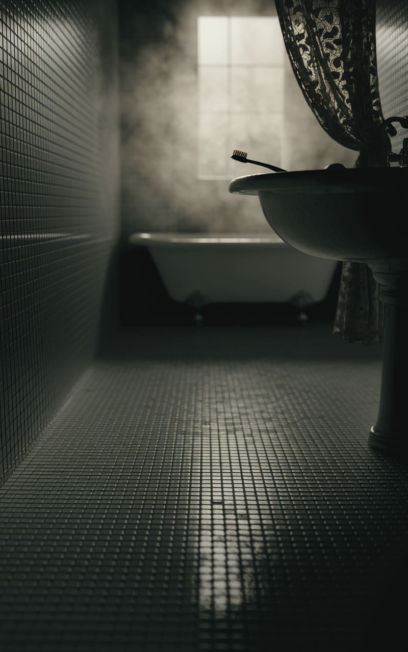 A sliver of light bleeds through a grimy window, casting a ghostly glow across the bathroom’s grid-tiled floor, the steam from a phantom bath swirling like a forgotten memory. A lone toothbrush rests precariously on the sink’s edge, a silent sentinel in a space where time seems to fold in on itself, the ornate lace curtain a dark, brooding whisper against the mundane.