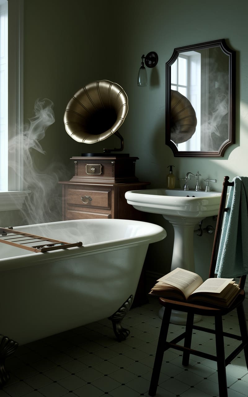 In the hushed, vapor-kissed stillness of a bathroom where time bends, a brass-belled gramophone serenades the steam curling from a clawfoot tub, its melancholic melody echoing in the framed reflection of a world slightly askew. A worn book rests open on a chair, a silent invitation to lose oneself in stories while the shadows lengthen, and the air grows thick with the unspoken, a liminal space where memories and dreams intertwine.