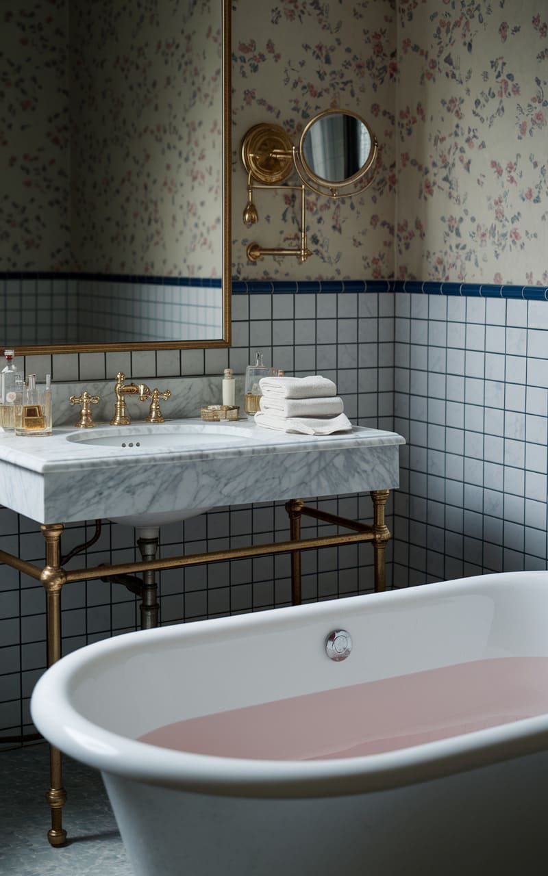 The bathroom whispers of a forgotten era, where floral wallpaper fades into a grid of cool tiles, a marble sink perched on brass legs like a relic from a grand hotel. A rose-tinted bath beckons, half-filled, promising a surreal soak in a space where time feels delightfully unmoored, a place where the familiar edges into the uncanny.