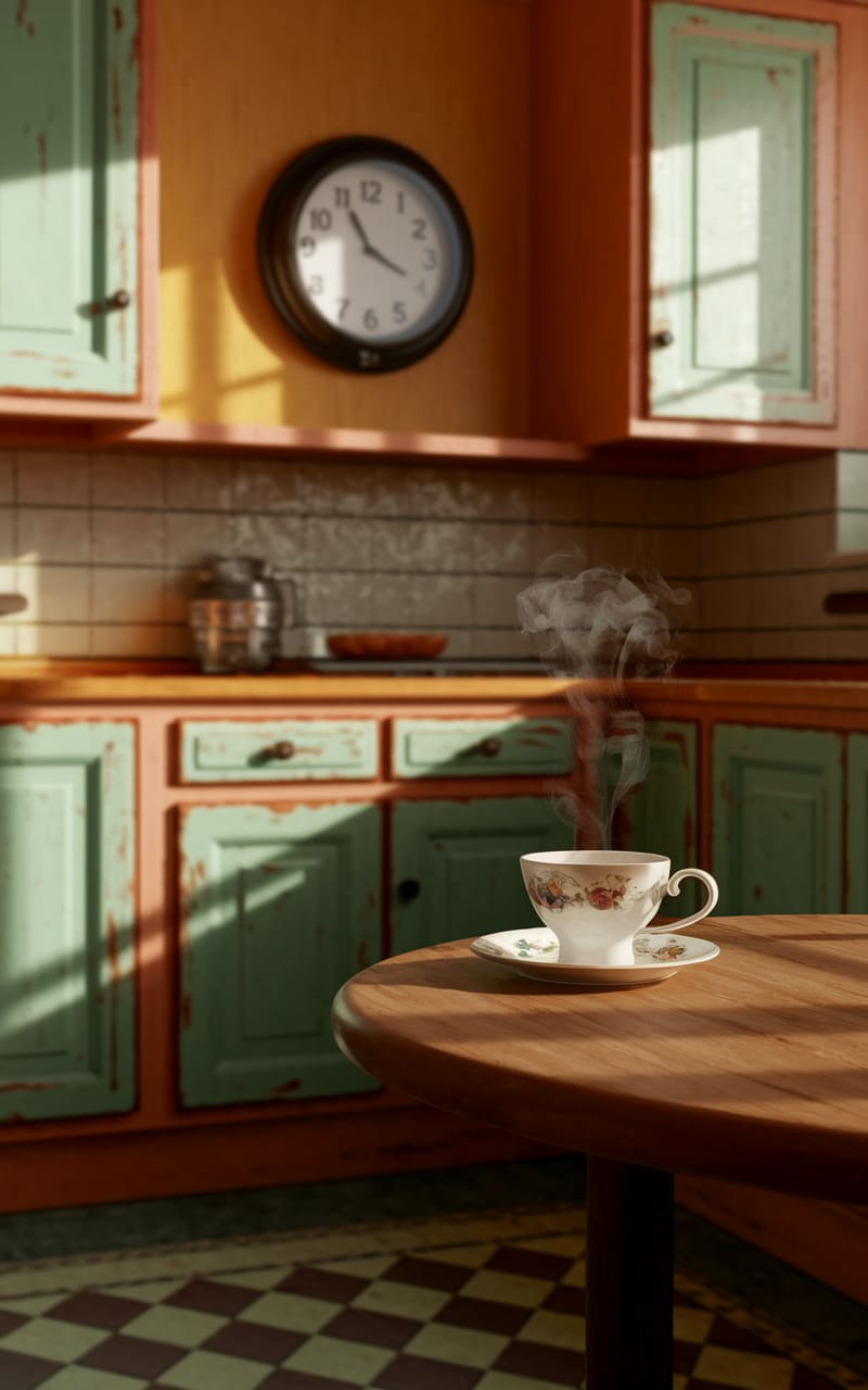 Sunlight slices through a kitchen that’s both cozy and unsettling, painting the chipped mint cabinets and tangerine walls with a dreamlike glow. A steaming teacup sits on a round table, the wisps of vapor blurring the already hazy edges of reality. The clock on the wall, frozen at an impossible time, whispers of forgotten afternoons and the unsettling feeling of being perpetually observed in a space that feels both familiar and deeply wrong.