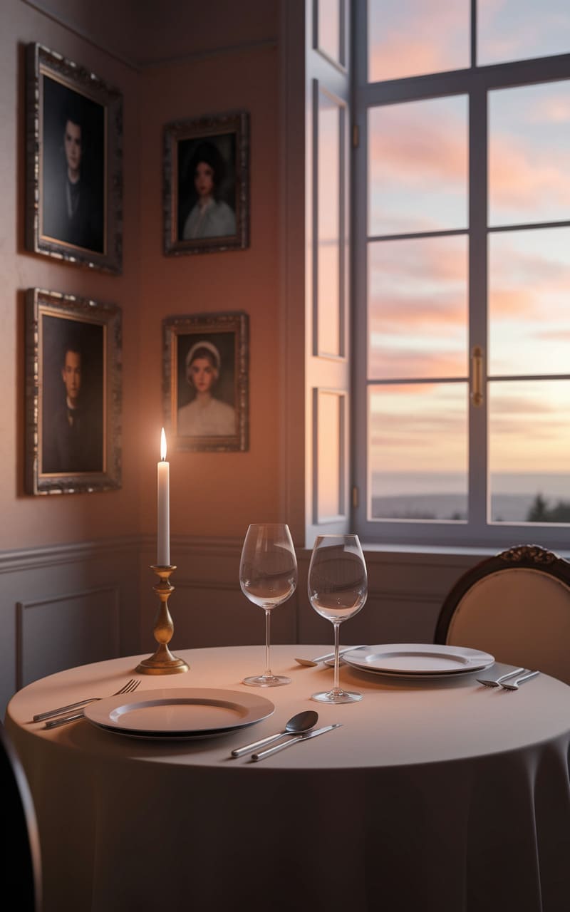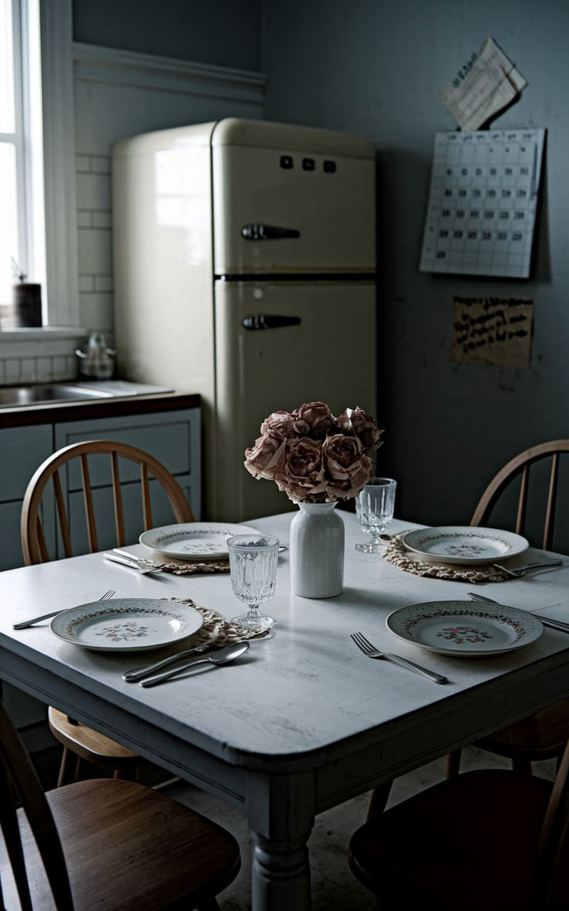 The kitchen hums with a quiet, unsettling nostalgia, its vintage fridge a silent sentinel in the dim corner. A perfectly set table for four awaits guests that never arrive, the delicate roses in the center a stark contrast to the peeling calendar and the faded, scribbled notes pinned to the wall. The light from the unseen window casts a melancholic glow, turning the everyday into a scene from a half-remembered dream, where time feels both suspended and strangely urgent.