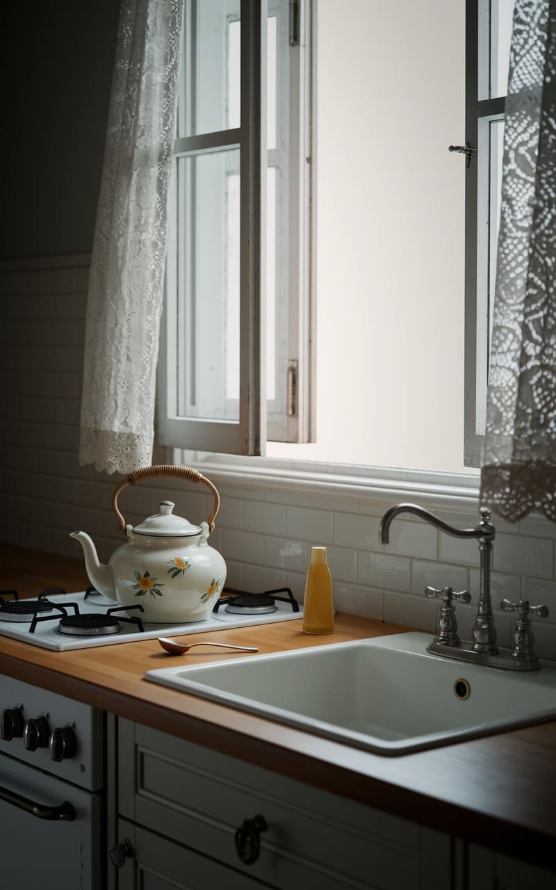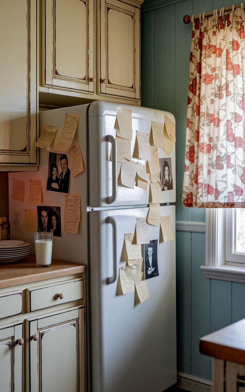 The kitchen hummed with a hazy, nostalgic chill, a vintage refrigerator plastered with faded notes and sepia-toned photos anchoring the space like a forgotten memory. Cabinet doors, distressed and cream-colored, hinted at a past grandeur, while the pale blue wainscoting and floral-printed curtain cast a soft, dreamlike light, blurring the edges of reality and leaving a lingering sense of quiet unease. It was a space suspended between cozy and unsettling, a place where time seemed to fold in on itself.