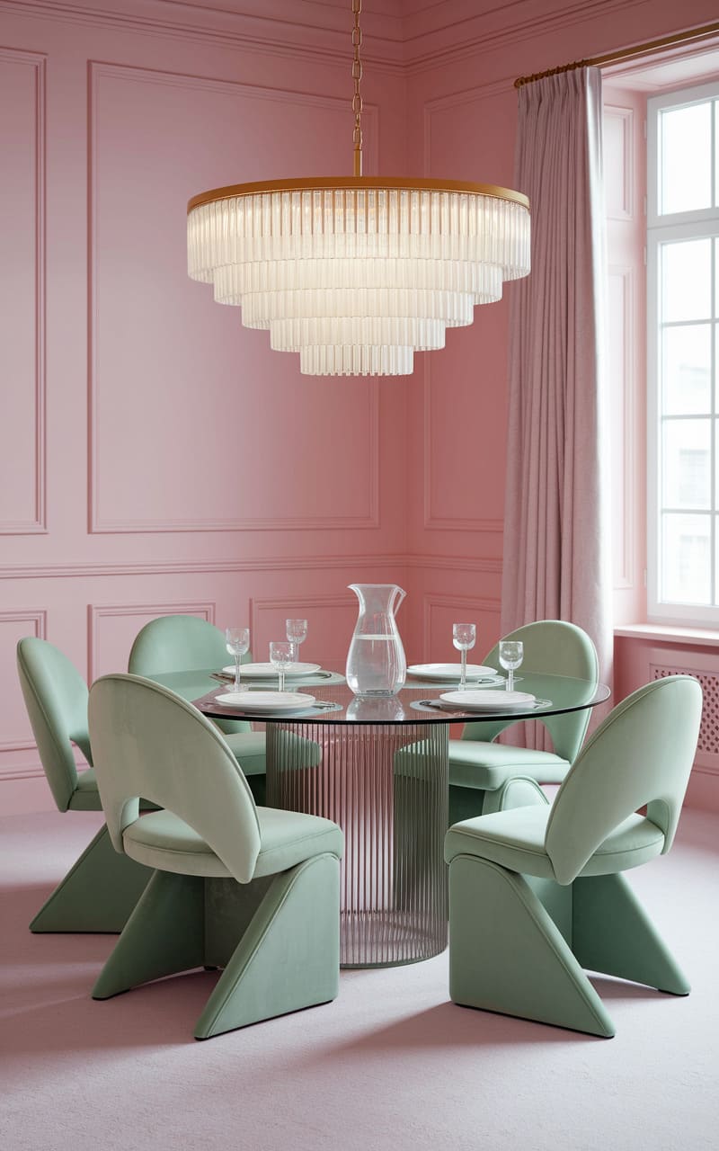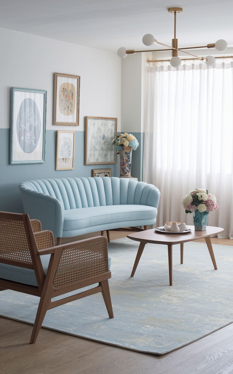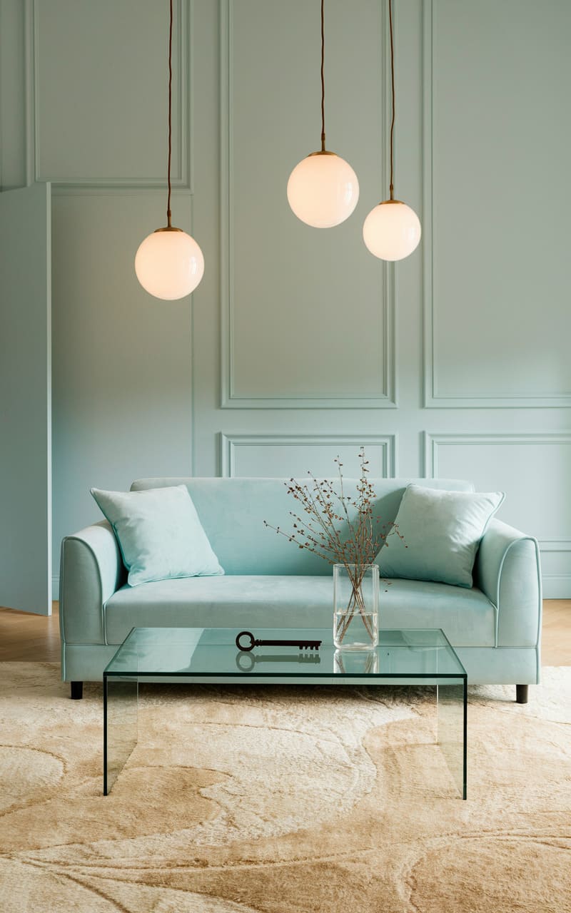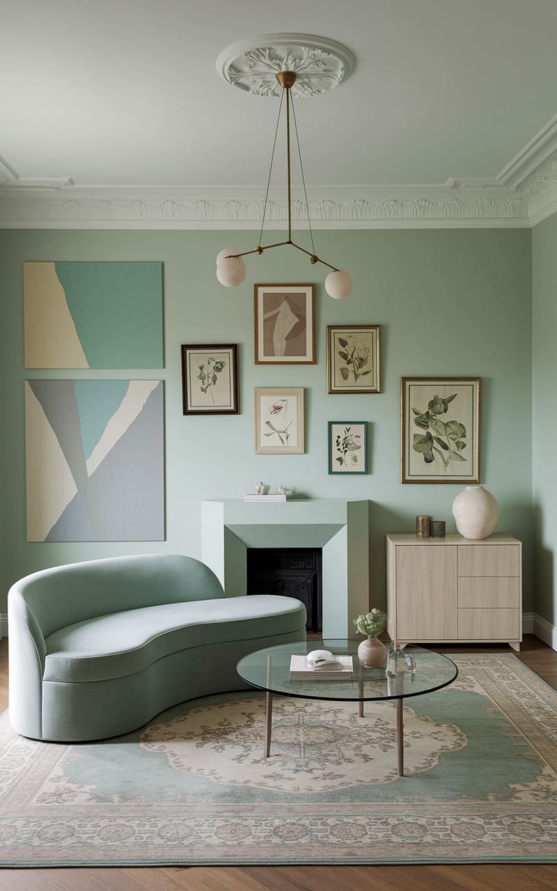 A mint-washed parlor, where a serpentine sofa melts into the wall’s soft hue, holds a curated collection of framed flora and abstract whispers, all under the gentle glow of a brass-limbed chandelier. A glass table, a phantom disc, reflects the room’s quietude, while a rug with faded grandeur anchors the space, leaving you questioning if you’ve stumbled into a memory or a half-remembered dream.