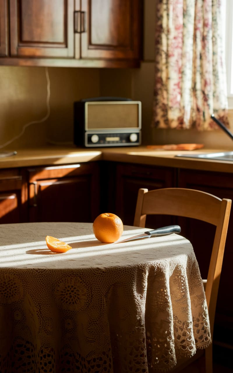 Sunlight slices through the dust-moted air of a kitchen where time seems to fold in on itself, an orange halved by an unseen hand sits on a lace-draped table, a radio hums a tune from a forgotten era, and the cabinets gleam with a warmth that feels both nostalgic and unsettling, a liminal space where the familiar becomes subtly, beautifully wrong.