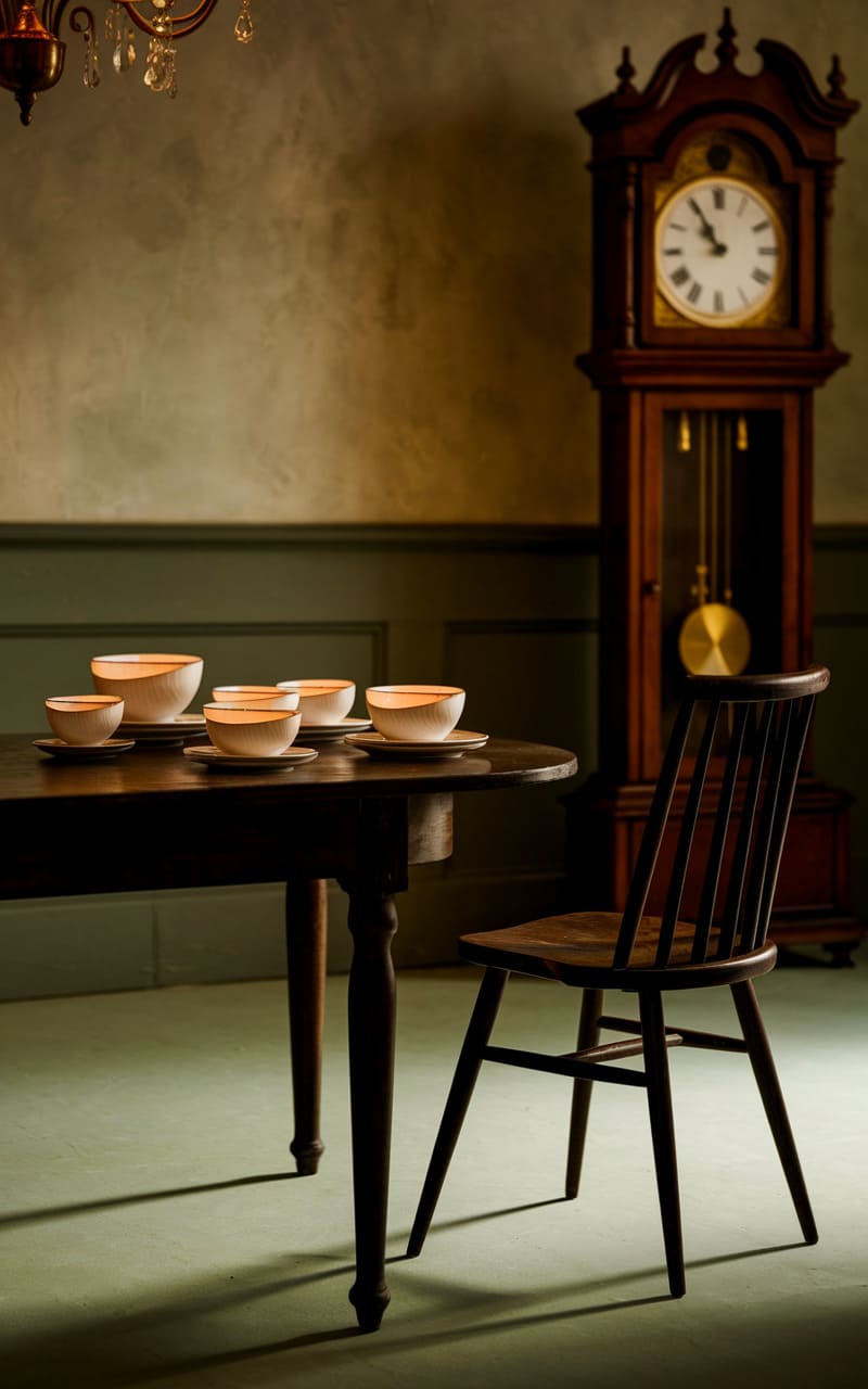 In a room bathed in the hazy glow of a perpetual late afternoon, a plush armchair with tufted buttons sits beside a skeletal rocking chair, both facing an unsettling parade of porcelain dolls perched atop a mantle. A cuckoo clock looms above, casting a long, distorted shadow, while lavender sprigs in a glass vase offer the only hint of life in this uncanny tableau. The wallpaper, a faded floral pattern, whispers of bygone eras, adding to the room’s unsettlingly familiar yet disturbingly off-kilter atmosphere.