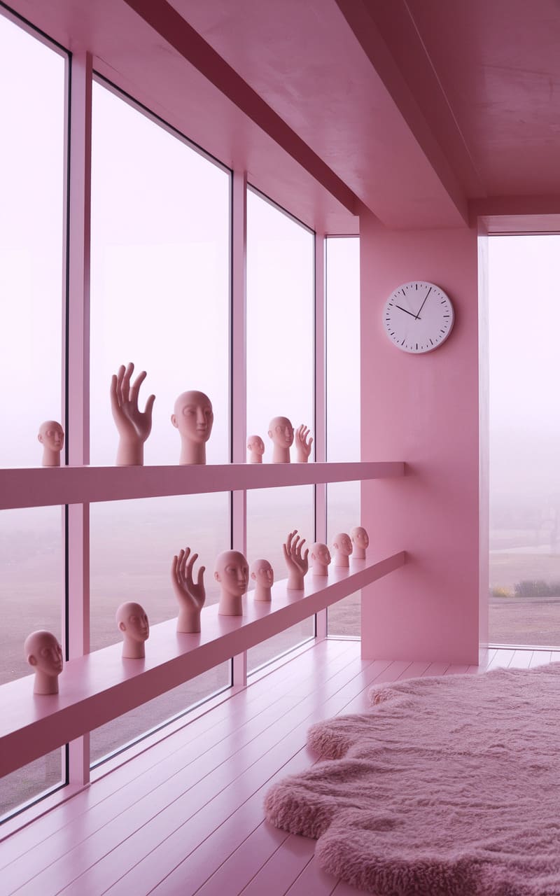 The hallway stretched, a fleshy pink tunnel promising an endless, sterile journey. A woven runner, the color of sun-bleached sand, pointed towards a distant, circular mirror that reflected only a sliver of the same unsettling expanse. Ceiling lights, like pale, watchful eyes, cast a dim, clinical glow, while a lone potted plant, a splash of green defiance, stood sentinel against the overwhelming sameness, hinting at a life struggling to root in this unsettling, pastel-drenched void.