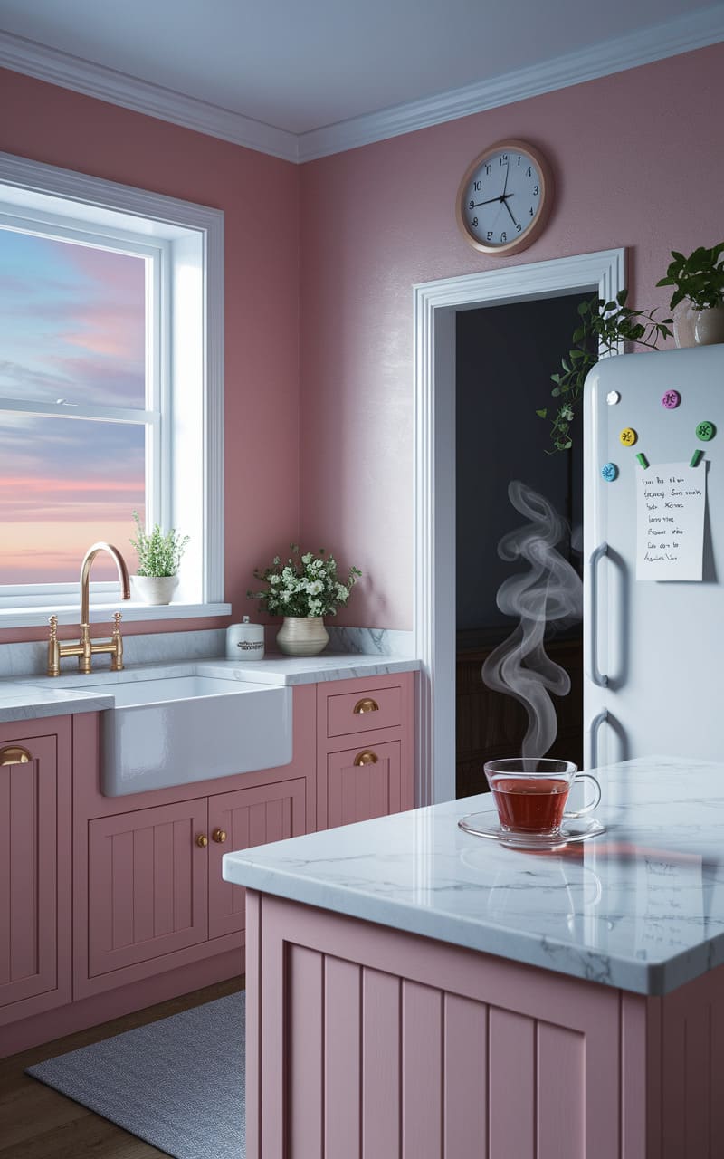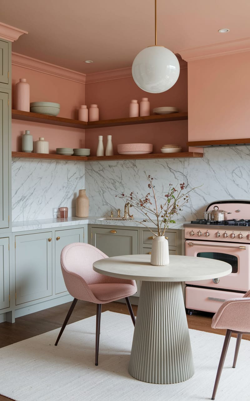 126. Blush Pink and Soft Gray Dreamcore Kitchen with a Cozy Breakfast Nook