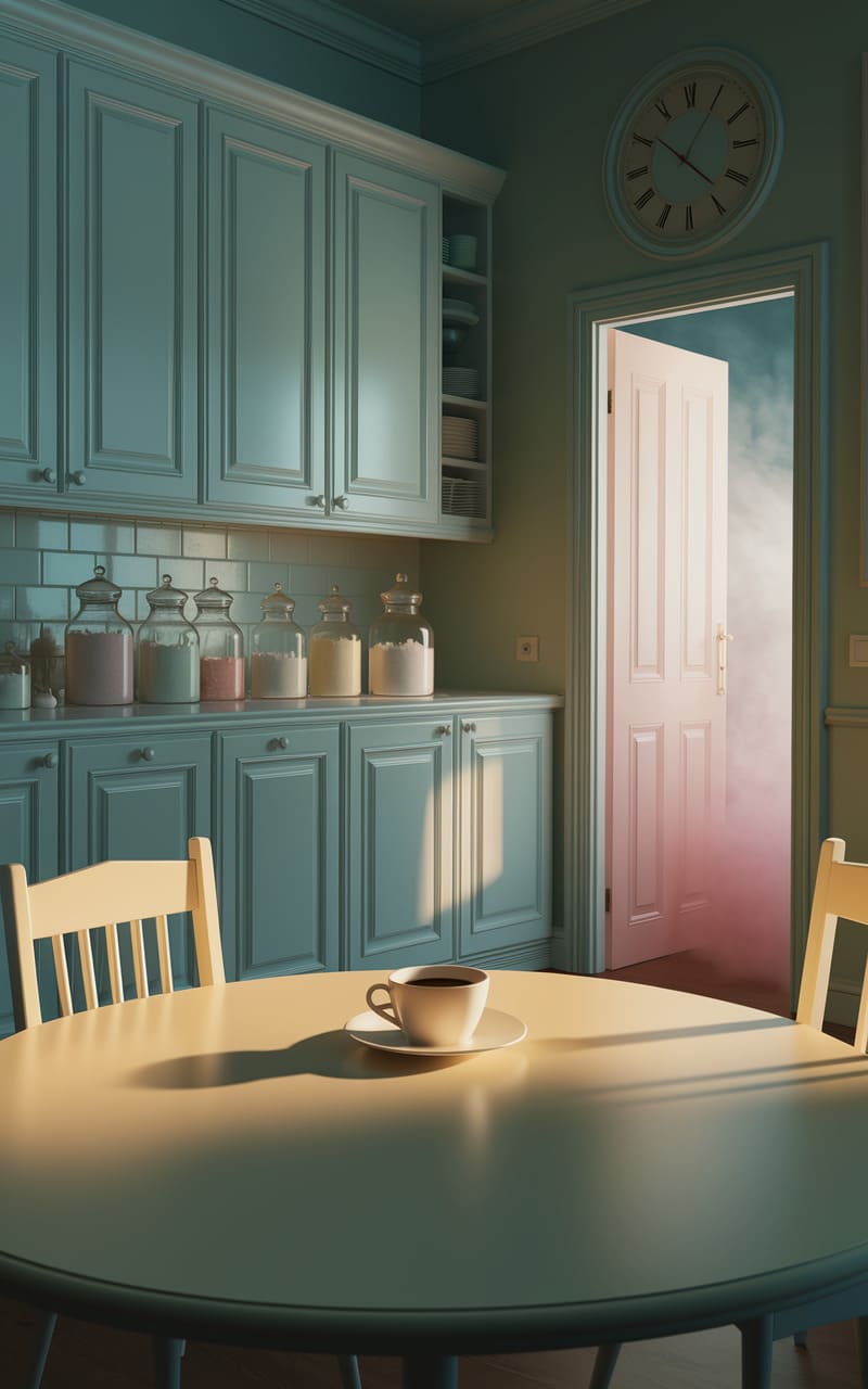The kitchen shimmered, a pastel mirage where the soft blue hues of the cabinets bled into the walls, blurring the lines between solid and dream. Twin orbs of light hung suspended, casting a warm glow that felt both inviting and strangely detached, as if the room existed just beyond the veil of waking reality. The perfectly arranged dishes in the arched shelves hinted at a meal perpetually prepared but never consumed, a tableau of domesticity trapped in the amber of a half-remembered memory.