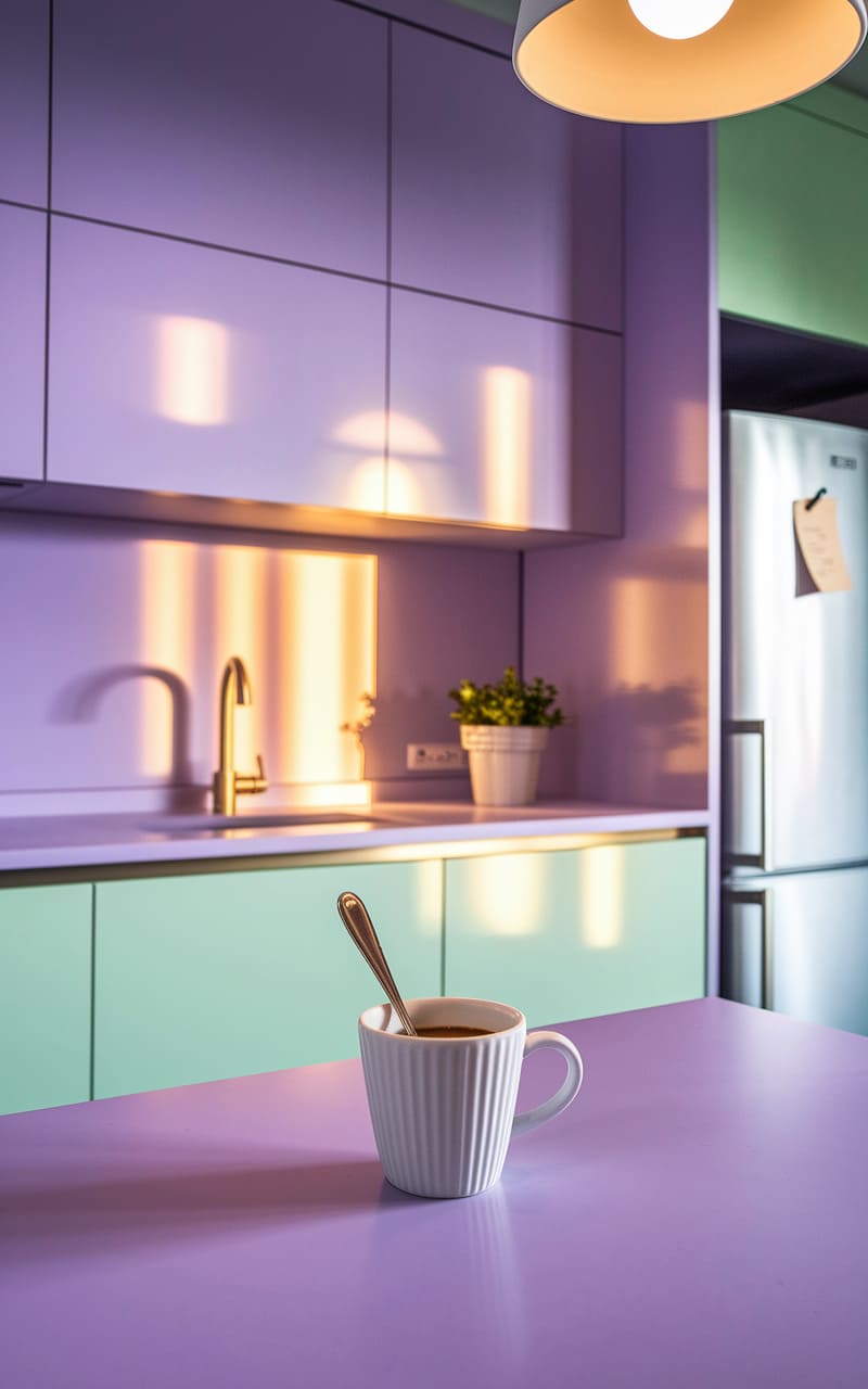 The kitchen hums with a quiet, off-kilter nostalgia, a pastel dreamscape where mint-green cabinets hold stacks of mismatched bowls, each whispering stories of forgotten tea parties. A blush-pink backsplash catches the light in a way that feels both familiar and unsettling, while a vintage stove stands ready to cook up something otherworldly, its brass knobs gleaming like lost coins in a forgotten arcade. The air is thick with the scent of sugar and the faint echo of a song you can’t quite place, a domestic scene warped into something beautifully, unsettlingly other.