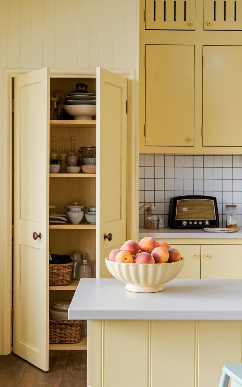 120. Pale Buttercream and Soft Blue Dreamcore Kitchen with Vintage Cabinets