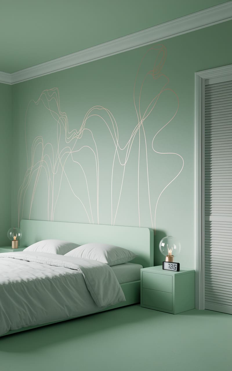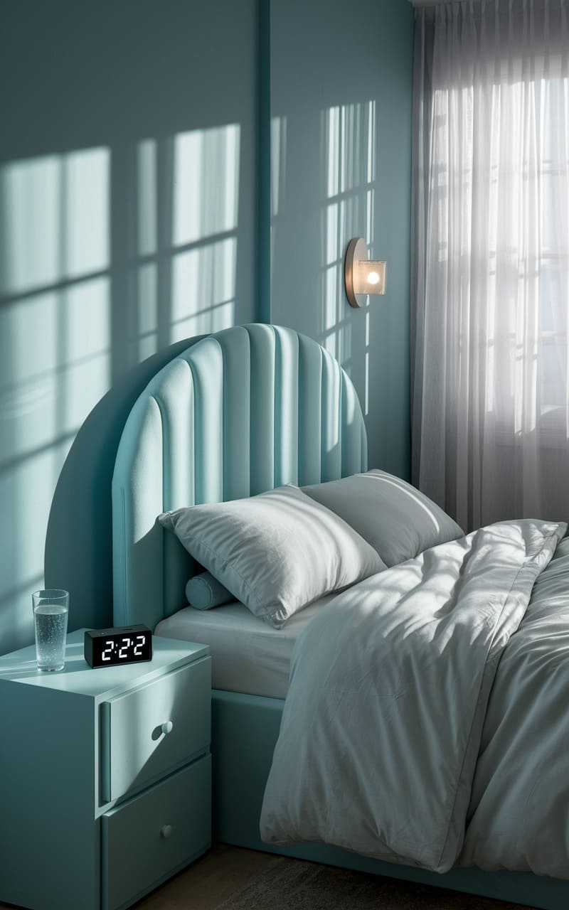 The bedroom hums with a quiet, minty stillness, a place where sleep feels less like rest and more like a soft, unending drift. The bed, piled high with linens the color of faded sea glass, invites a surrender, while the arched mirror reflects a space that seems to curve and shift, subtly distorting the room’s edges. Shadows deepen in the folds of the curtains, suggesting a world beyond the window is waiting, a world just as serene and subtly off-kilter as the room itself, a place where dreams leak into reality and the familiar becomes gently, unsettlingly strange.